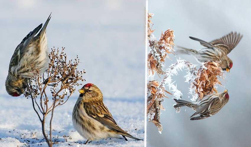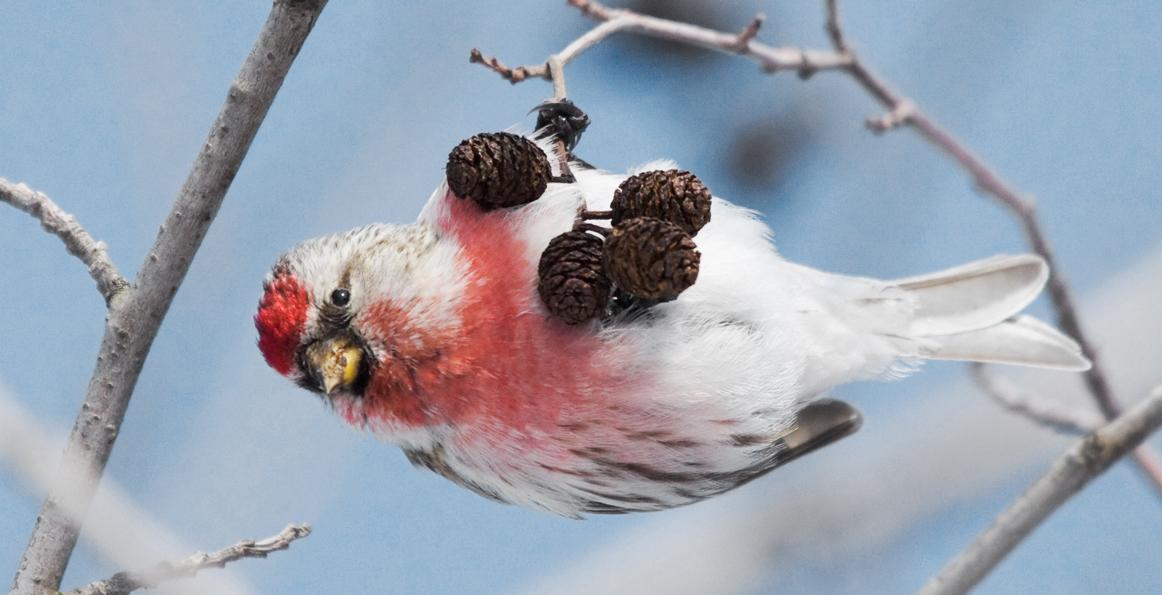 Быстрые маленькие (меньше воробья до 14 см, ) птички привлекают озорным характером и щебетом, напоминающим частый стук. Мы их называем чечетки, а на латыни их имя означает «пламенная колючка» за малиновые перья на груди и вытянутые перья на спине. Говорливые и яркие щебетуньи появляются стайками, привлеченные сохранившимися семенами и морожеными ягодами в холодное время.Очень нежно и красиво. А зеленые веточки добавляют картинке яркости и позитива