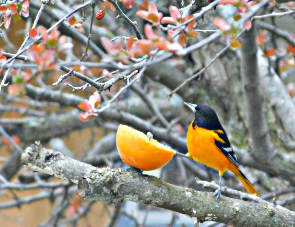 БИ – небольшая (до 18 см) воробьинообразная птица. Иволгам не родственница, была так названа за чисто внешнее сходство. А «балтиморская» - за сходство расцветки самцов с цветами на гербе лорда Балтимора (Черный и оранжево-красно-желтый). Самки БИ серых и бледно-желтых тонов.Необыкновенная щедрость! Каждому, решившему кросс – не одна пичуга в награду, а целый выводок. Плюс роскошный гобелен с цветущими ветками)))