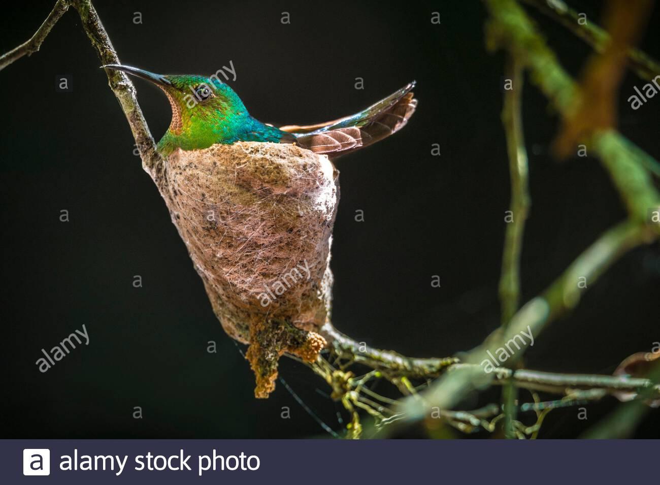 Гнездо самка колибри устраивает на свисающей над водой растительности, в переплетении лиан или скалистых углублениях. Крепится жилище к поверхности с помощью птичьей слюны. В подобных местах можно иной раз увидеть целые колонии гнездящихся самок.
