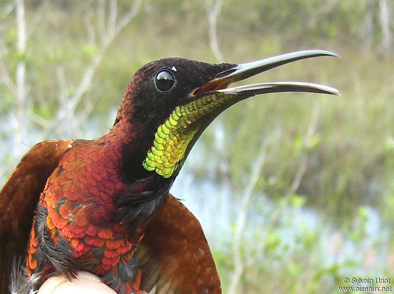 Самка в основном зеленая с красноватым горлом и менее блестящая.