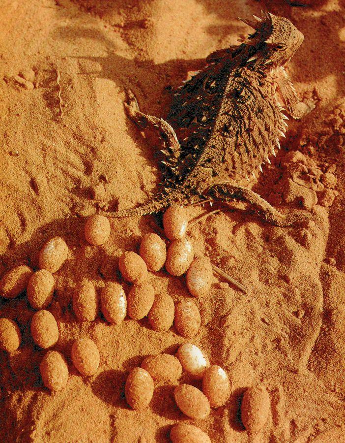 8-10. Познав "радости брачного ложа", самка откладывает в песок яйца, и на этом ее заботы заканчиваются. Вылупившиеся крохотные ящерички сразу зарываются в песок. И в дальнейшем заботятся о себе сами.