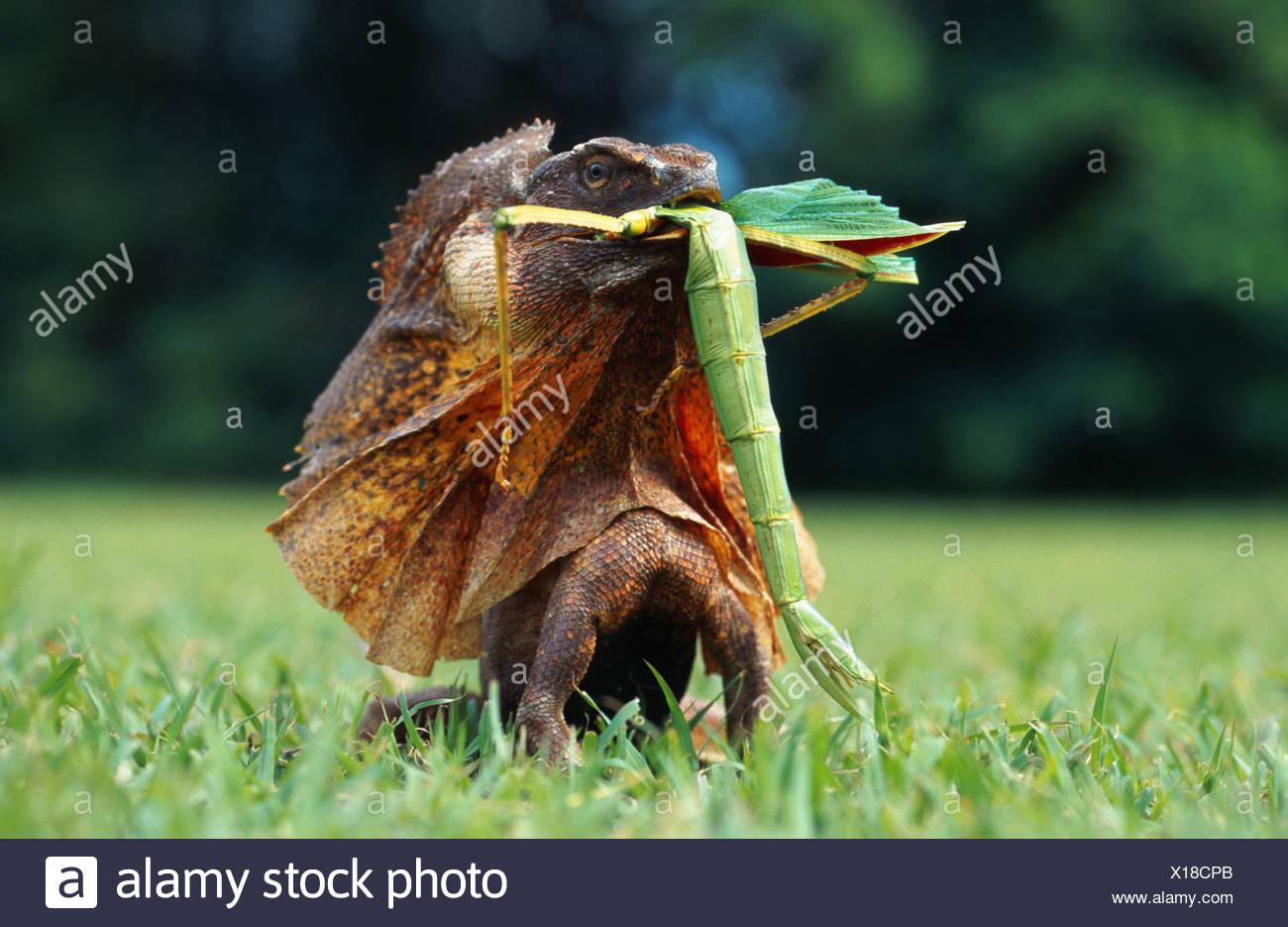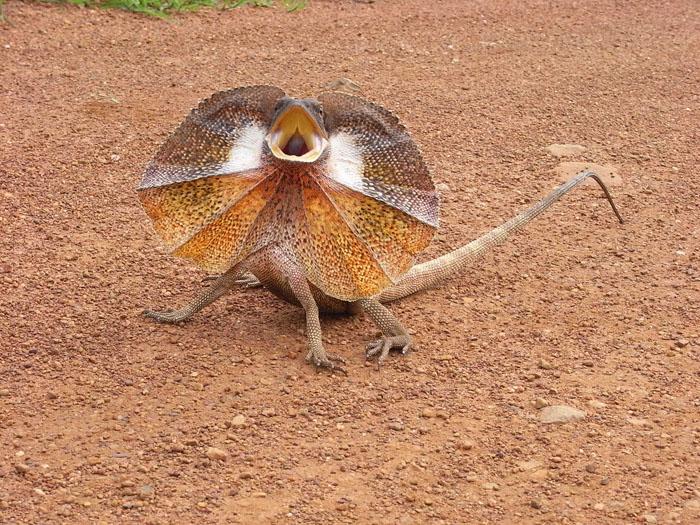Если это не срабатывает, ПЯ начинает издавать шипящие звуки, широко разинув пасть, раскрывать воротник-зонтик, крутить хвостом и вставать на задние ноги. Часто преследователь от неожиданности идет на попятную.