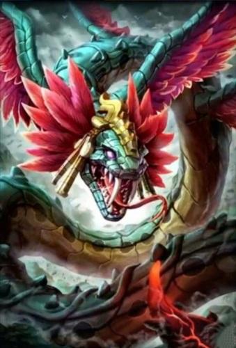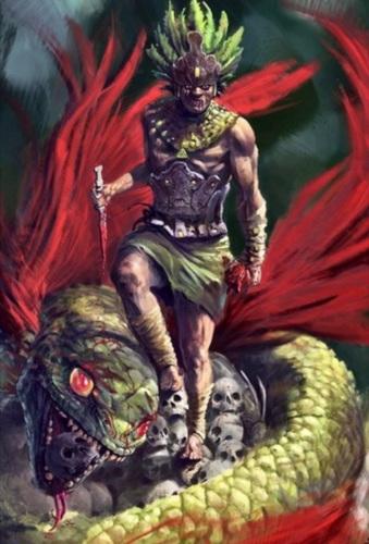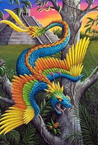 К.– "крылатый змей", в мифологии майя – одно из главных божеств. К. – бог четырех Святых Даров – огня, земли, воздуха и воды; и каждый элемент был связан с божественным животным или растением: Воздух – Орел, Земля – Кукуруза, Огонь – Ящерица, Вода – Рыба. В рукописях и скульптуре майя, Кукулькан представлен по крайней мере шестью символическими образами. В основном это образ змея. Он также изображался в виде орла, ягуара, крови, раковины улитки и как костяная флейта.Какое шикарное воплощение божества!