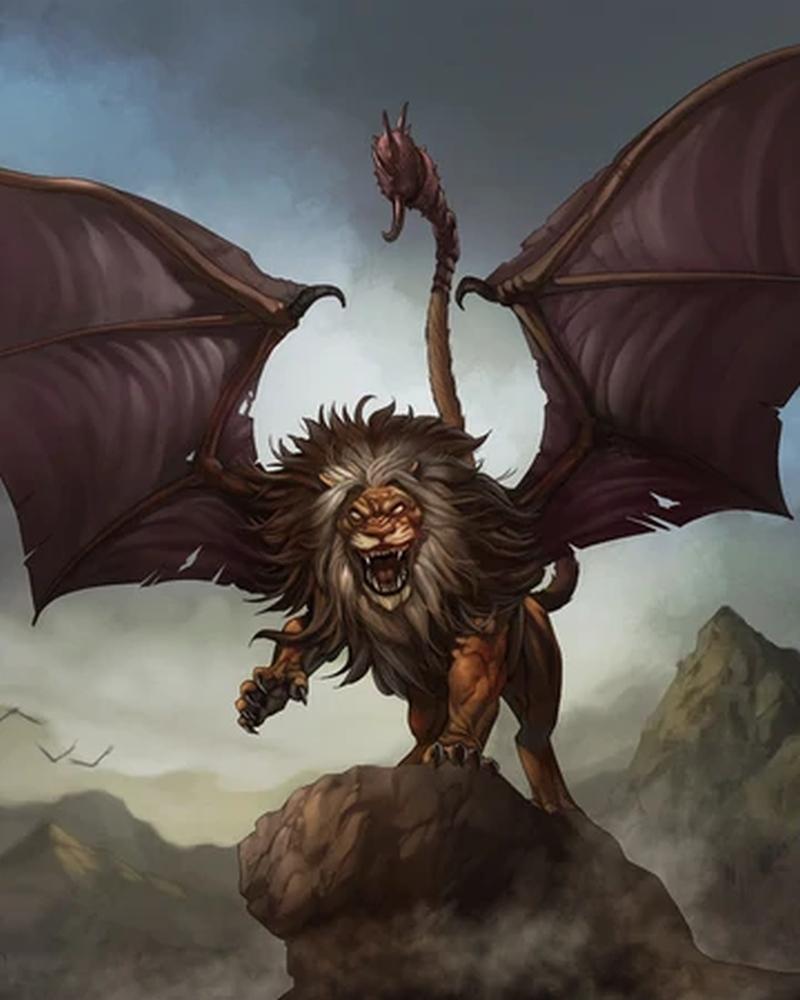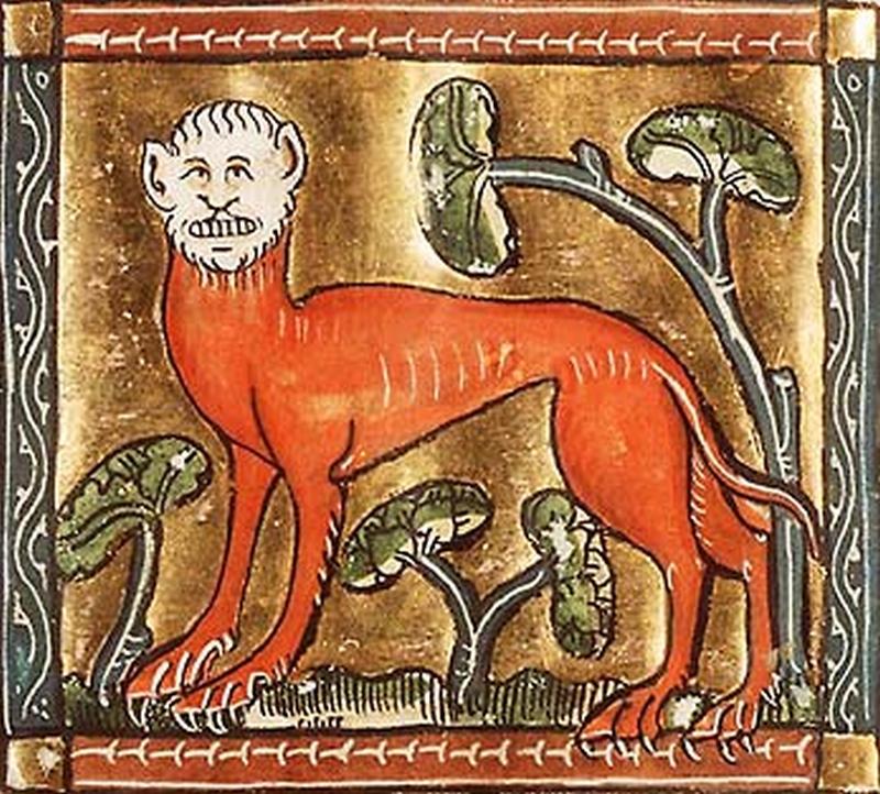 Отцом этого дивного создания был Ктесий, личный врач персидского царя Артаксеркса II, написавший в IV в. до н.э. первый в античности труд об Индии — "Индику". М. - «животное размером со льва, с похожими на человеческие лицо и ушами, с хвостом как у скорпиона, с шипами, которыми М. выстреливает, поражая врагов, и голосом, сочетающим звуки флейты и трубы. М. кроваво-красного цвета, дикий, и любит человеческое мясо. Живёт в Индии»Грозное пополнение авторского бестиария!