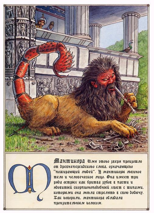 "Живет в Индии. Тело у нее львиное, а голова и морда человечьи, но с пастию ужасной, в три ряда зубищ острых снабженной. Крылья у М. орлиные, хвост же скорпионий, ядовитой иглой оканчивающийся. Яд свой, мгновенно отравляющий, берет мантикора из дерева богун упас именуемого. Нападает на людей из засады, убивает и сжирает так, что ни косточки, ни даже металлических "молний" от курток и пуговиц от штанов не остается.