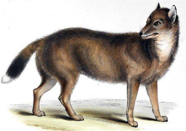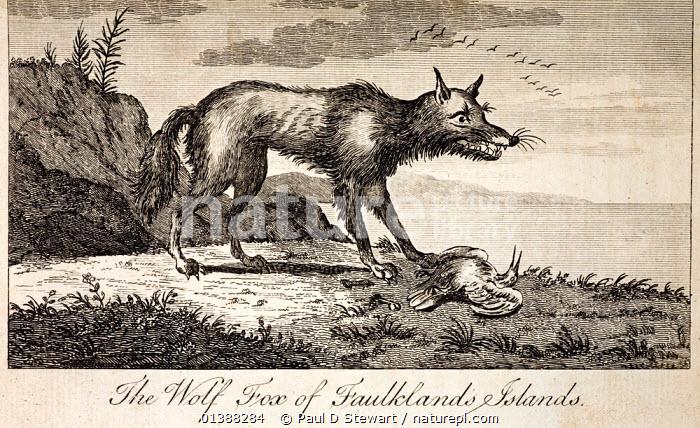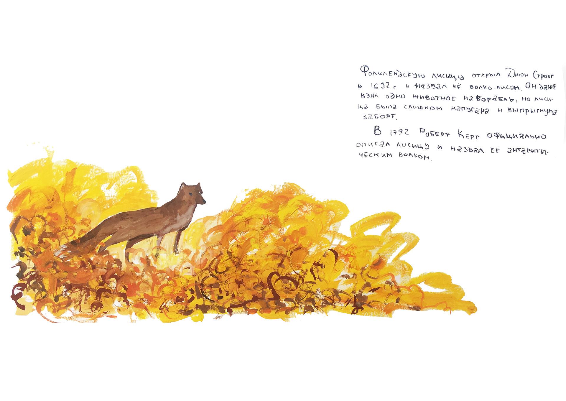 Строго говоря, ФЛ не лисица. Этот зверь ростом с койота (ок. 60 см в холке) и внешне напоминал его, лаял по-собачьи, а генетически — близкий родственник ю-ам. гривистого волка. Только пушистый хвост был похож на лисий. Обитала ФК только на Фолклендских о-вах. Более того, она была там единственным наземным млекопитающим, охотилась на птиц и ластоногих и поедала выброшенную морем падаль.Красивое животное с несчастной судьбой.