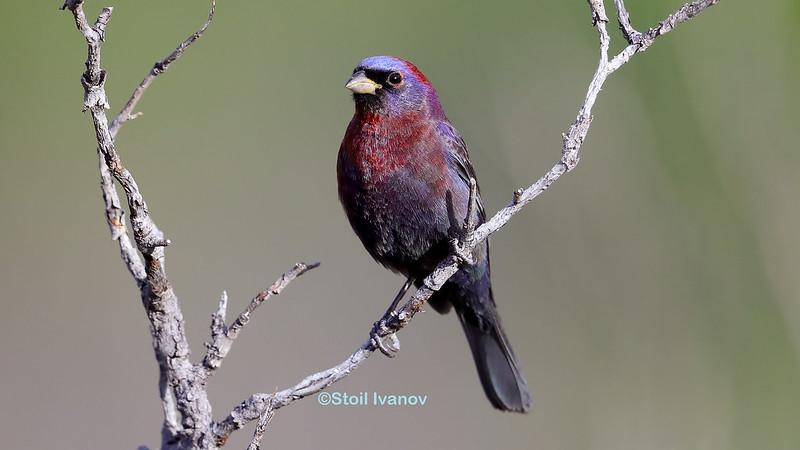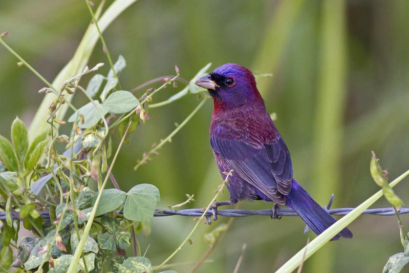 Брачная окраска самцов представляет собой потрясающие переливы насыщенного сливового, малинового, вишнево-красного и лавандово-фиолетового цветов. В тени их излюбленных мест обитания — пустынного колючего леса, зарослей ручьев, редколесий и заросших полян — оперение тускнеет, и птицы кажутся черноватыми. Самочки, как водится, в основном коричневатой или оливковой окраски.