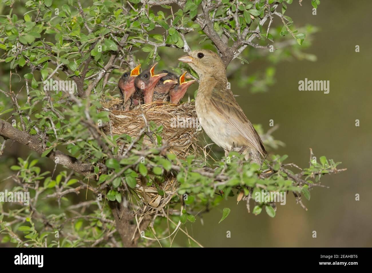 МОК плетут гнезда из травы и паутины на внешних ветвях колючих кустарников, обычно у воды.