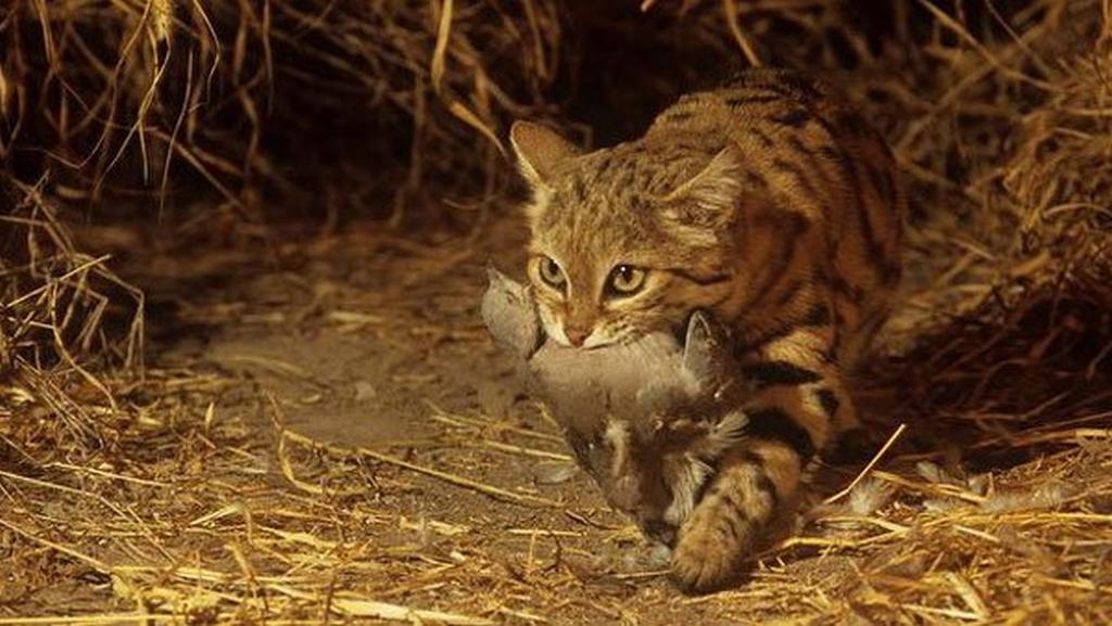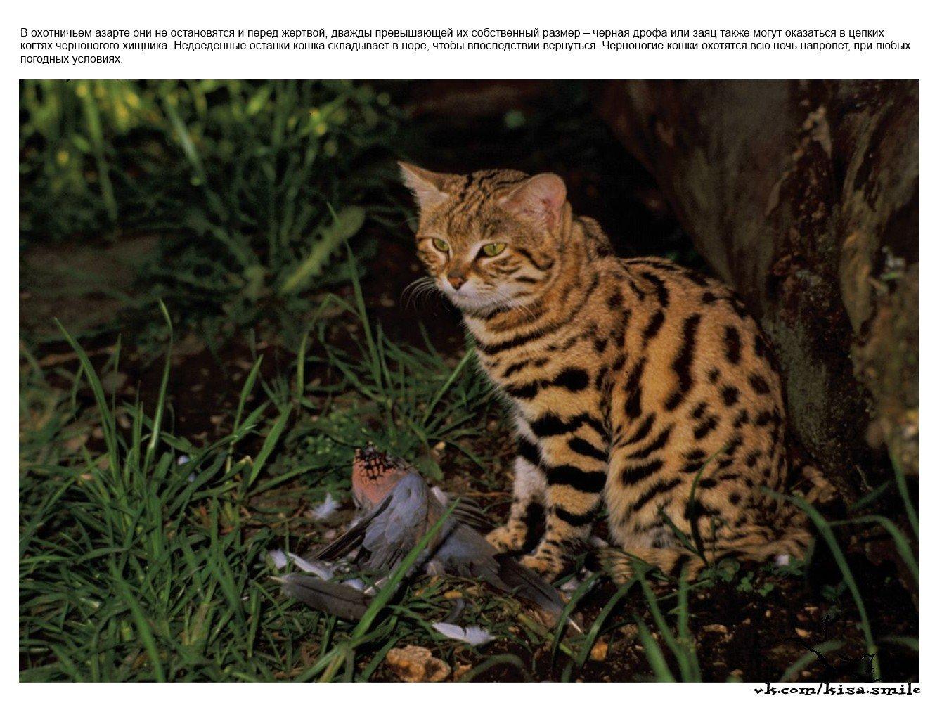 ЧК, обитающая на юге Африки - на сухих равнинах Кару и Калахари, в ЮАР, Ботсване и Намибии - самая маленькая африканская дикая кошка (до 45 см с хвостом). Тем не менее ЧК признана самой смертоносной кошкой на Земле. А у себя на родине известна под кличками «прожорливый дьявол» и «тигр термитников». Последняя - потому что часто живет в заброшенных термитниках (если не выкуривает из нор кроликов, дикобразов или трубкозубов), а повадками и агрессивностью напоминает тигра.Однако! Какая пусенька, и какая, оказывается, опасная!