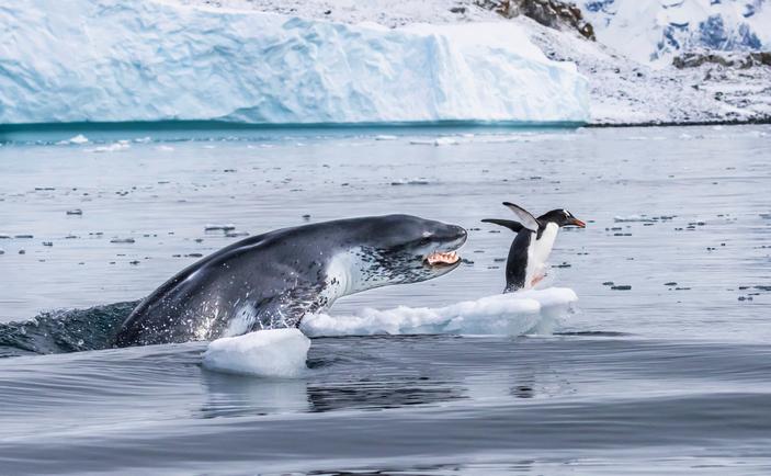 На первом фото - охота морского леопарда. Фото имеет говорящее название "Если бы пингвины могли летать"...