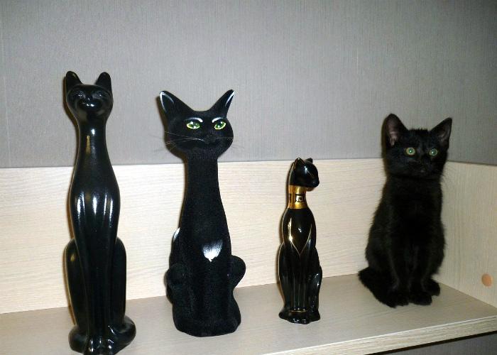 На стене висит картина, где на разном фоне нарисован один и тот же черный кот. А настоящий кот, с которого рисовали, сидит перед этой картиной и сливается с ней