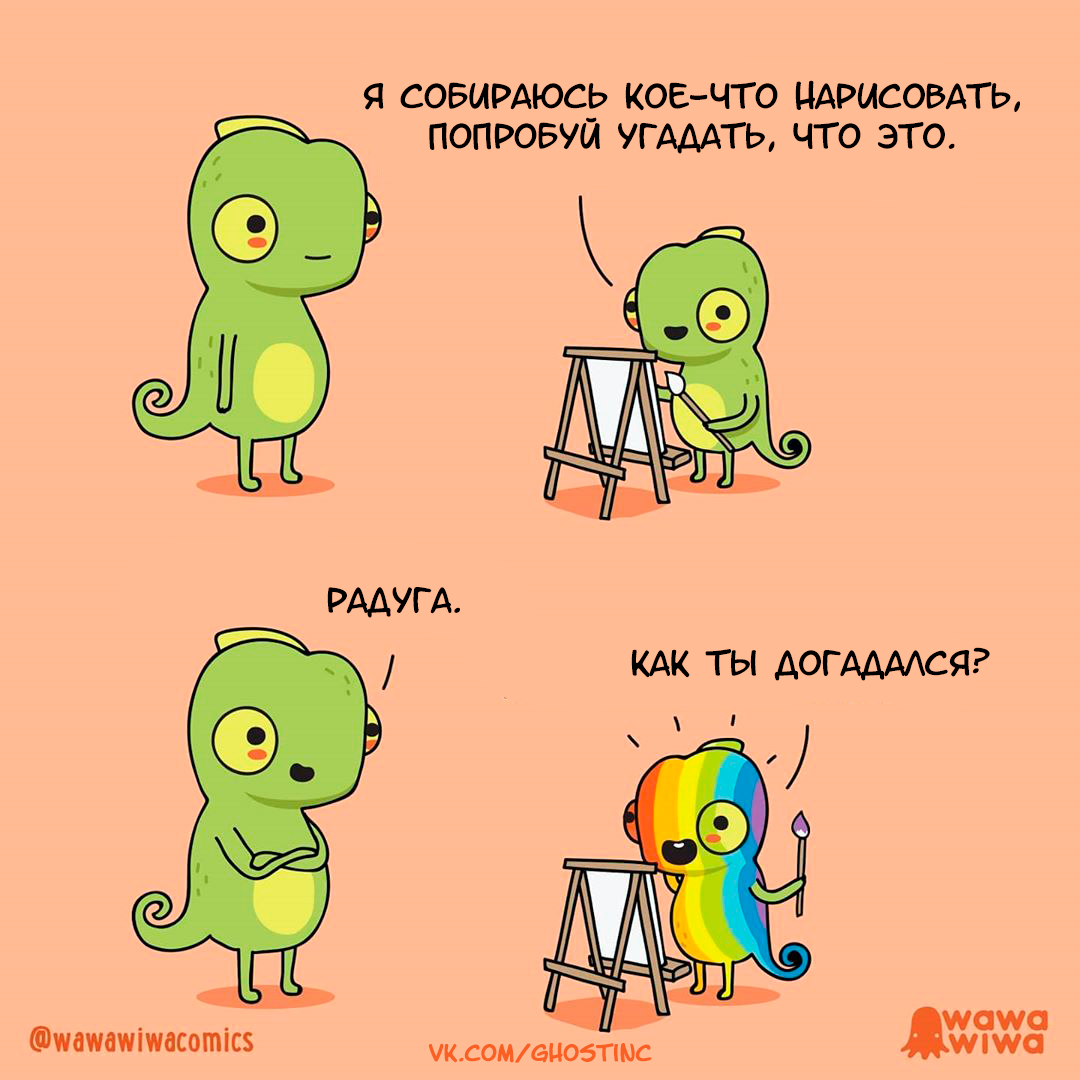 Сколько уже было рисунков с радугой - и все их разгадывать очень интересно! Ну а идея с хамелеоном вообще очень разнообразило радужную серию :)