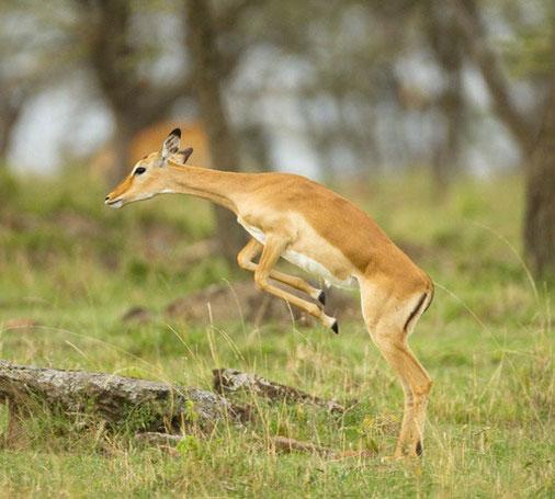 6-7. Что вы скажете о том, как импала «висит» в воздухе? Да, складывается такое впечатление, когда она, почуяв опасность, молниеносно взвивается в воздух, поджимая под себя ноги и откидывая назад голову, а после как будто замирает на несколько секунд, и… стремглав несется прочь, легко перескакивая через самый высокий куст.