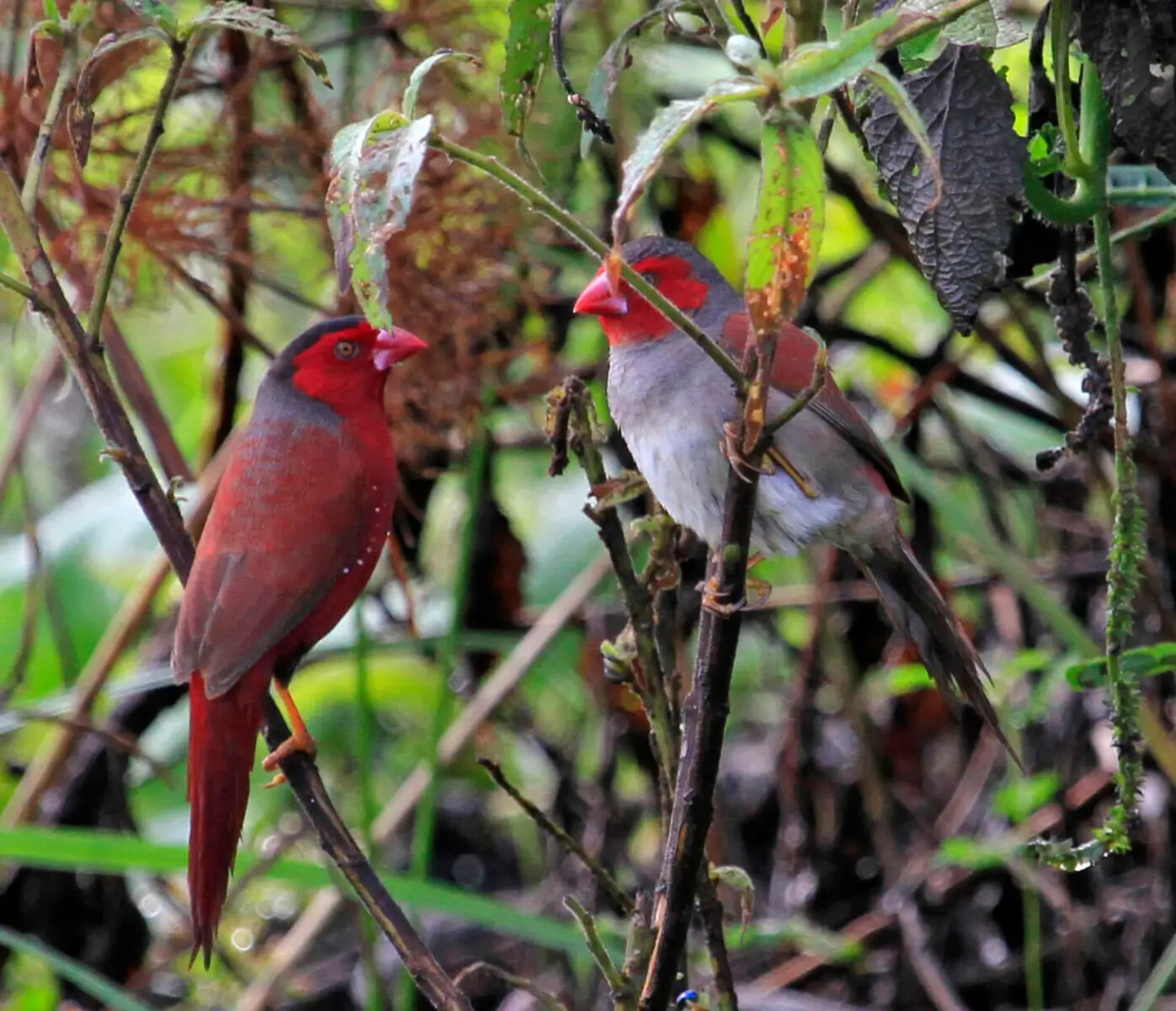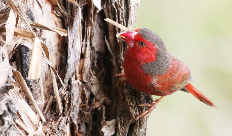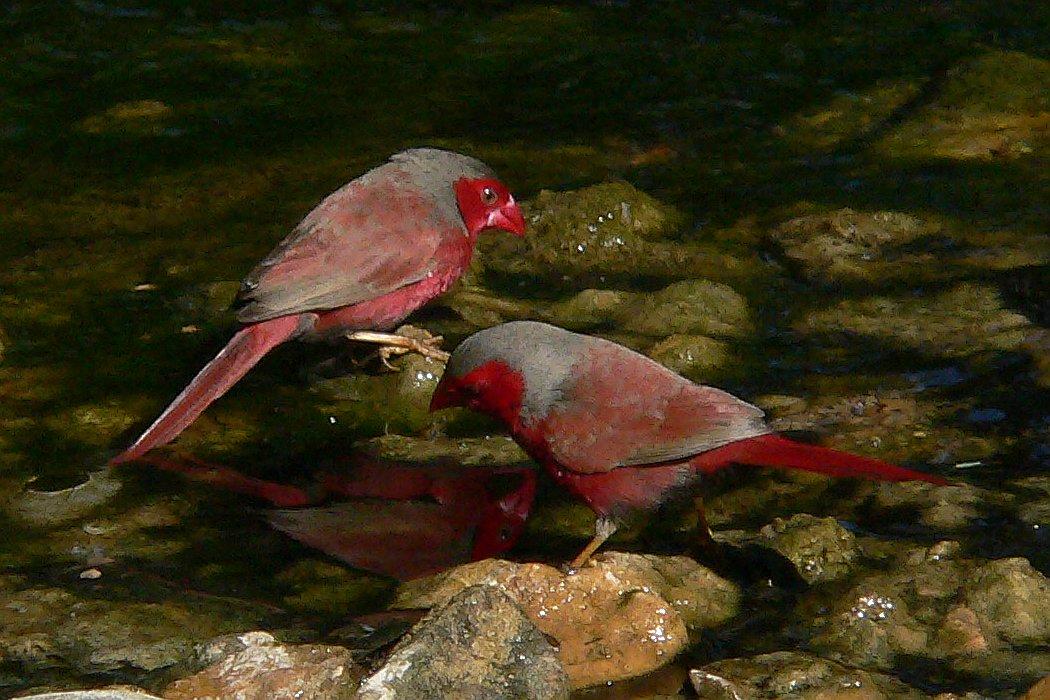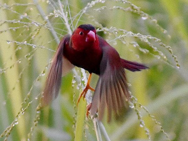 Рубиновые (солнечные) астрильды (певчие птички ок.15 см) обитают в с. Австралии и на южном выступе Н. Гвинеи. Живут парами или небольшими группами на травянистых равнинах у краев болот, водоемов и вблизи рек. В межгнездовой период собираются в стаи по нескольку сот штук и мигрируют в поисках подходящего корма. Питаются семенами трав, которые собирают на земле. Гнезда строят на земле, в кустах и на деревьях, с охотой гнездятся на жилищах человека, под водосточными трубами и желобами или в отверстиях крыш. Для строительства гнезда используют гниющий материал, который приносит самец, а самка его укладывает. Гнездо выстилают мелкими листьями, перьями, шерстью и волосом. В жаркие дни, когда температура воздуха достигает 40 °С, птицы до 6 часов могут покидать гнездо с кладкой или птенцами, но когда температура опускается, сразу же возвращаются в гнездо, а когда прохладно или идут дожди, то сидят добросовестно весь день. Ночуют в гнезде вместе.Действительно, живой рубин! Очень красивая птичка.