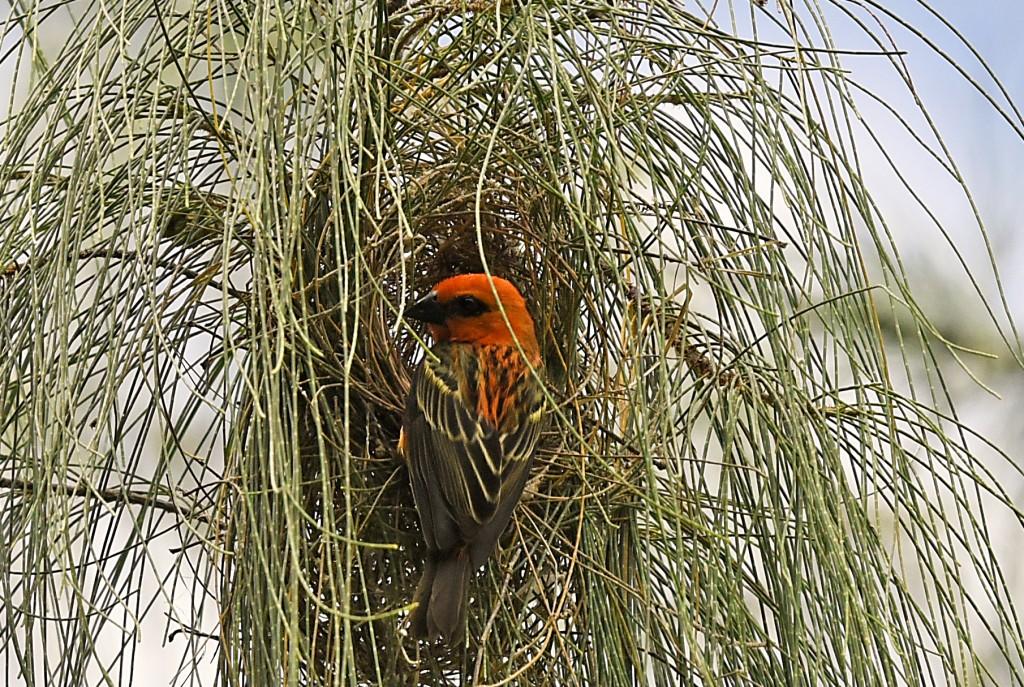 5. Вне брачного периода фуди являются одиночками, особенно самцы предпочитают находиться подальше от самок. Но когда приходит время гнездования, самцы начинают привлекать к себе самок и демонстрировать ей свои строительные навыки. Свои гнезда они вьют в высокой траве, кустарниках, пальмах и деревьях на высоте до восьми метров. Как и все ткачики, фуди – прекрасные строители и гнезда «сплетают» очень искусно.