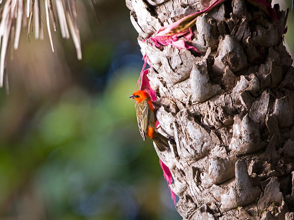 Красный фуди (пламенный ткач)- эндемик Мадагаскара, хотя в последние десятилетия он был ввезен на другие острова Индийского океана, напр. Коморы, о. Реюньон, Маврикий, Сейшельские о-ва, и многие другие, где климат и условия позволяют свободно жить и размножаться. Он хорошо прижился на новых местах обитания и распространился так же широко, как и на исторической родине.Интересный кросс, красивая птичка и очень оживляющая картинку растительная декорация.