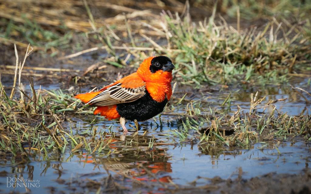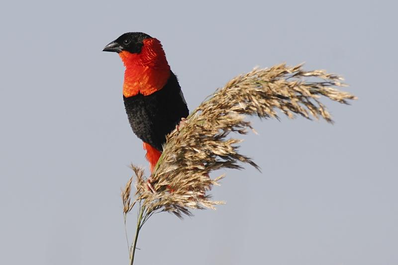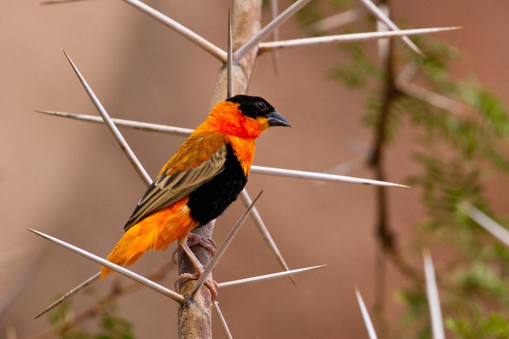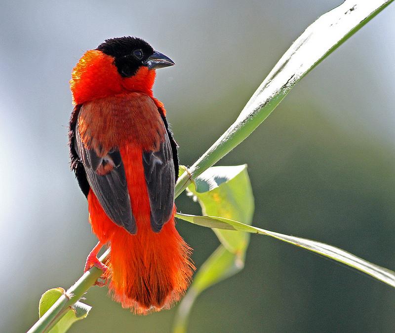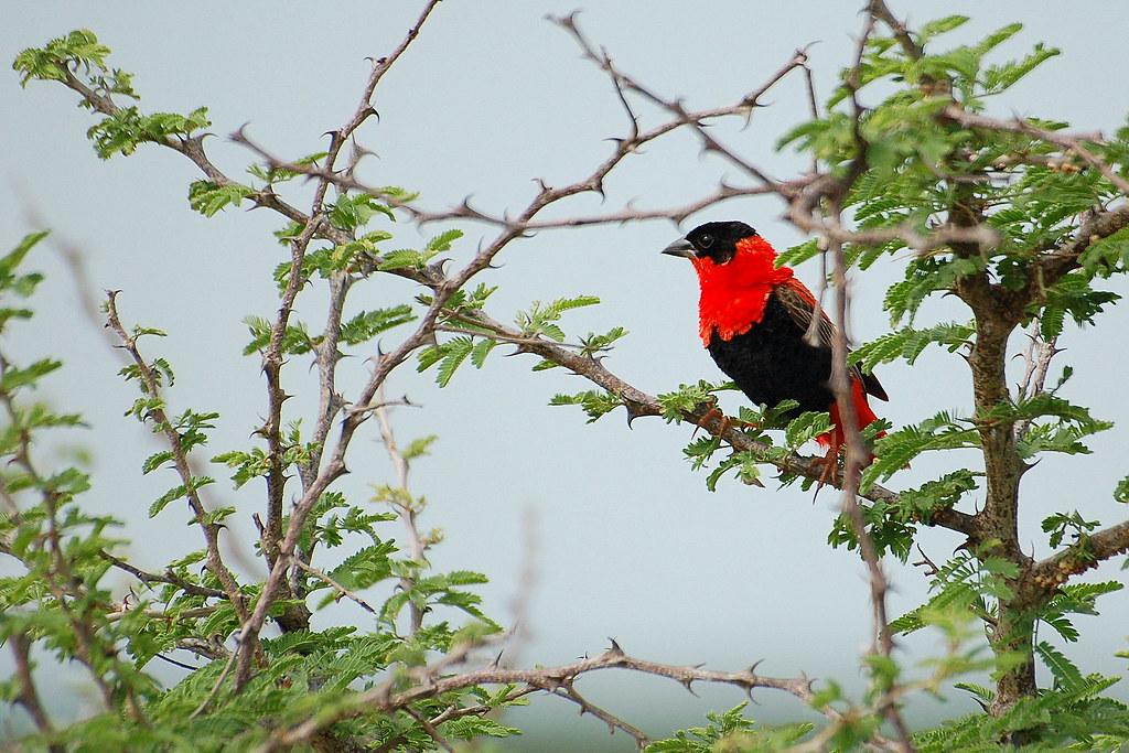 Красно-черный брачный наряд этих 15-см ткачиковых поражает. На голове у них яркий хохолок, грудь и нижняя сторона крыльев черные, а спинка, хвост и верх крылышек – красные. А самки неприметные, серо-коричневые.
