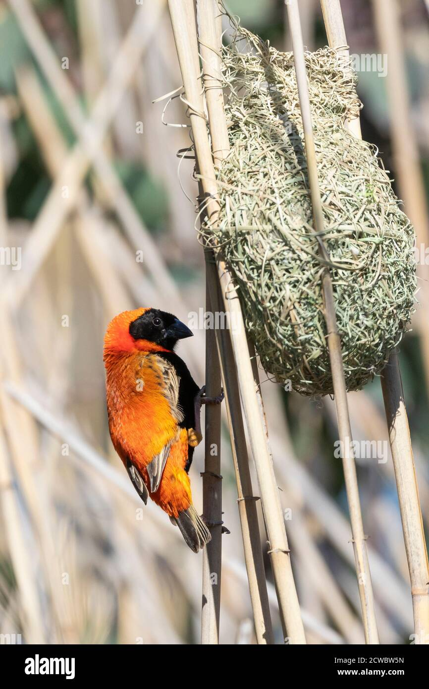 Живут бархатные ткачи небольшими колониями. Строительством гнезд занимаются самцы. Причем один кавалер может построить сразу несколько домиков в надежде создать мини-гарем. Гнезда у них аккуратные, полностью закрытые, с одним боковым входом. Именно за умение искусно их плести эти птички и стали называться ткачами.