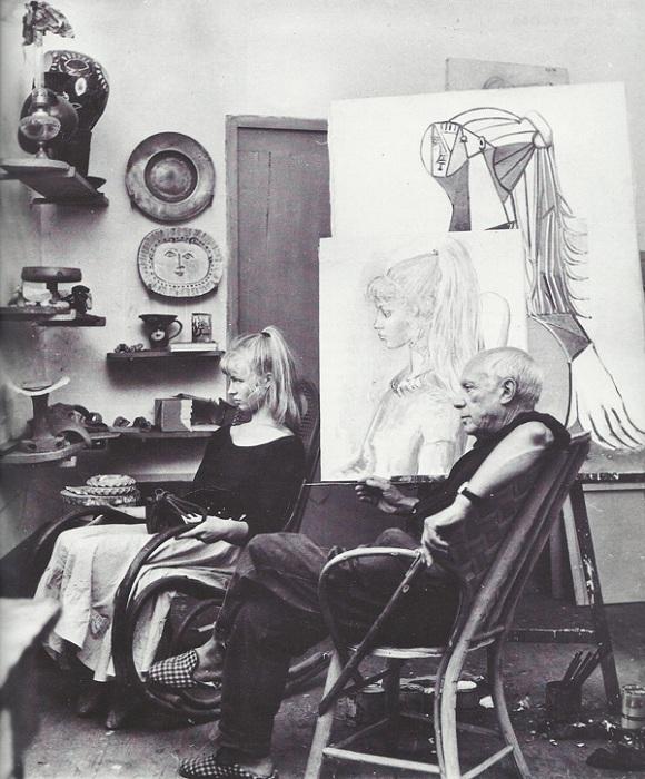 Переживая очередную депрессию после ухода Франсуазы Жило с детьми, Пикассо искал новый источник вдохновения для творчества. Весна 1954 года принесла ему встречу в Валлорисе, на Лазурном берегу с милой 19-летней блондинкой с роскошными вьющимися волосами. Пикассо в миг оценил достоинства девушки, сделал набросок с натуры и решил познакомиться поближе.Вчера вечером начала решать - бросила: цвета сливались. Сегодня при дневном свете закончила - просто классно! Ничего не сливалось. Наоборот замечательно тона переливаются, переходят один в другой. Очень искусная работа, прекрасно переложено в кросс, одними серыми оттенками - и их даже меньше, чем 50))).