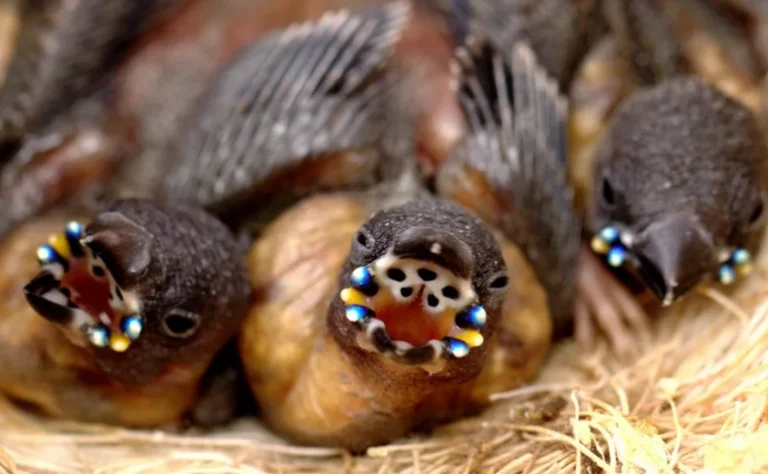 (Природные "светоотражатели" нужны, чтобы родители могли сунуть еду птенцу в полной темноте. Эдакие посадочные огни)))