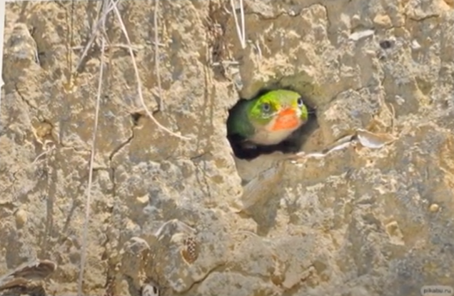 Верхняя часть зеленая, шея — красная с синими вставками. Белое брюшко с красными пятнами, желтые снизу крылышки и красно-оранжевый клюв — словно на карнавал птица собралась.