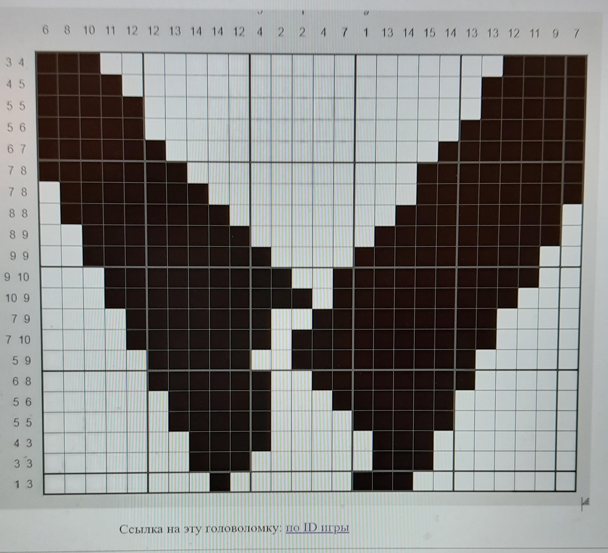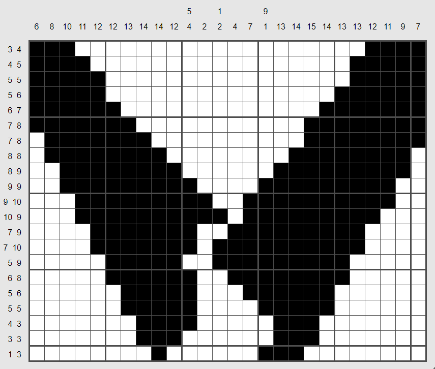 ответитьhttps://www.chiark.greenend.org.uk/~sgtatham/puzzles/js/pattern.html#26x21:6/8/10/11/12/12/13/14/14/12/5.4/2/1.2/4/7/9.1/13/14/15/14/13/13/12/11/9/7/3.4/4.5/5.5/5.6/6.7/7.8/7.8/8.8/8.9/9.9/9.10/10.9/7.9/7.10/5.9/6.8/5.6/5.5/4.3/3.3/1.3