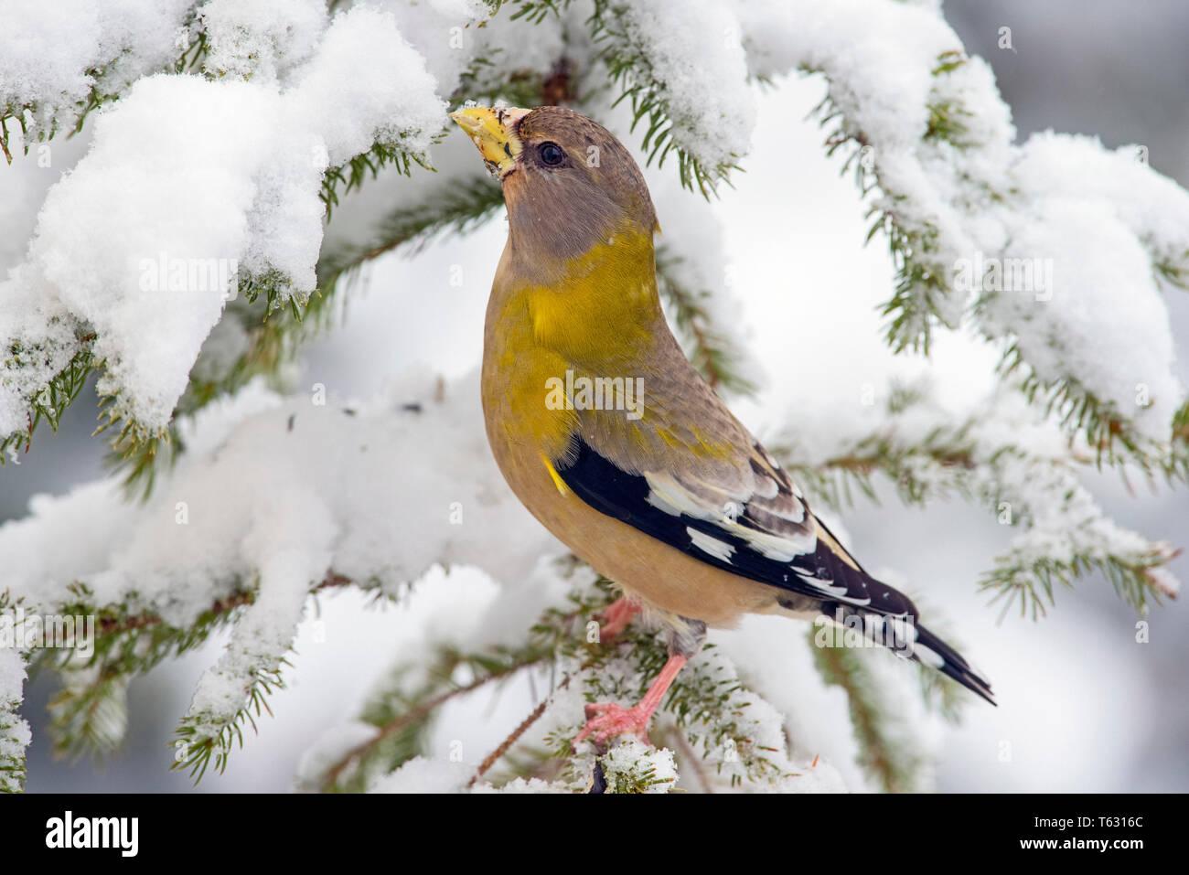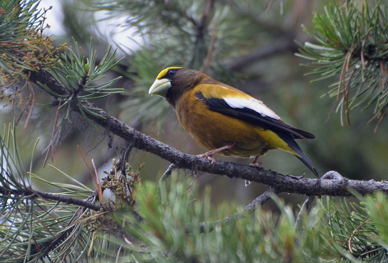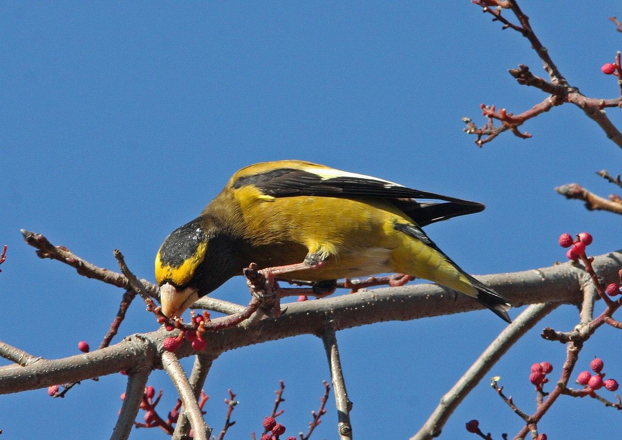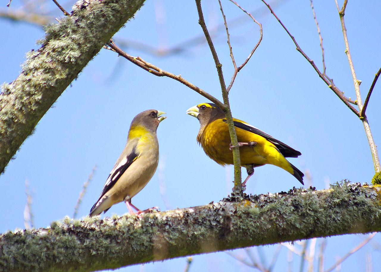 Вечерний американский дубонос - небольшая (ок. 18 см) вьюрковая птичка. Они считаются певчими, но их вокал очень бедный и состоит из пронзительных криков и чириканий. А «вечерними» дубоносов назвали потому, что изначально ошибочно считалось, что они поют лишь в сумерках.Очень красивая птичка!