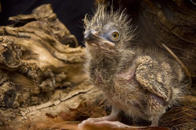 Маленькие птенцы очень забавные — они полностью покрыты торчащим во все стороны бурым пухом, а зачатки хохолка у основания клюва делают их похожими на мультяшных дракончиков.