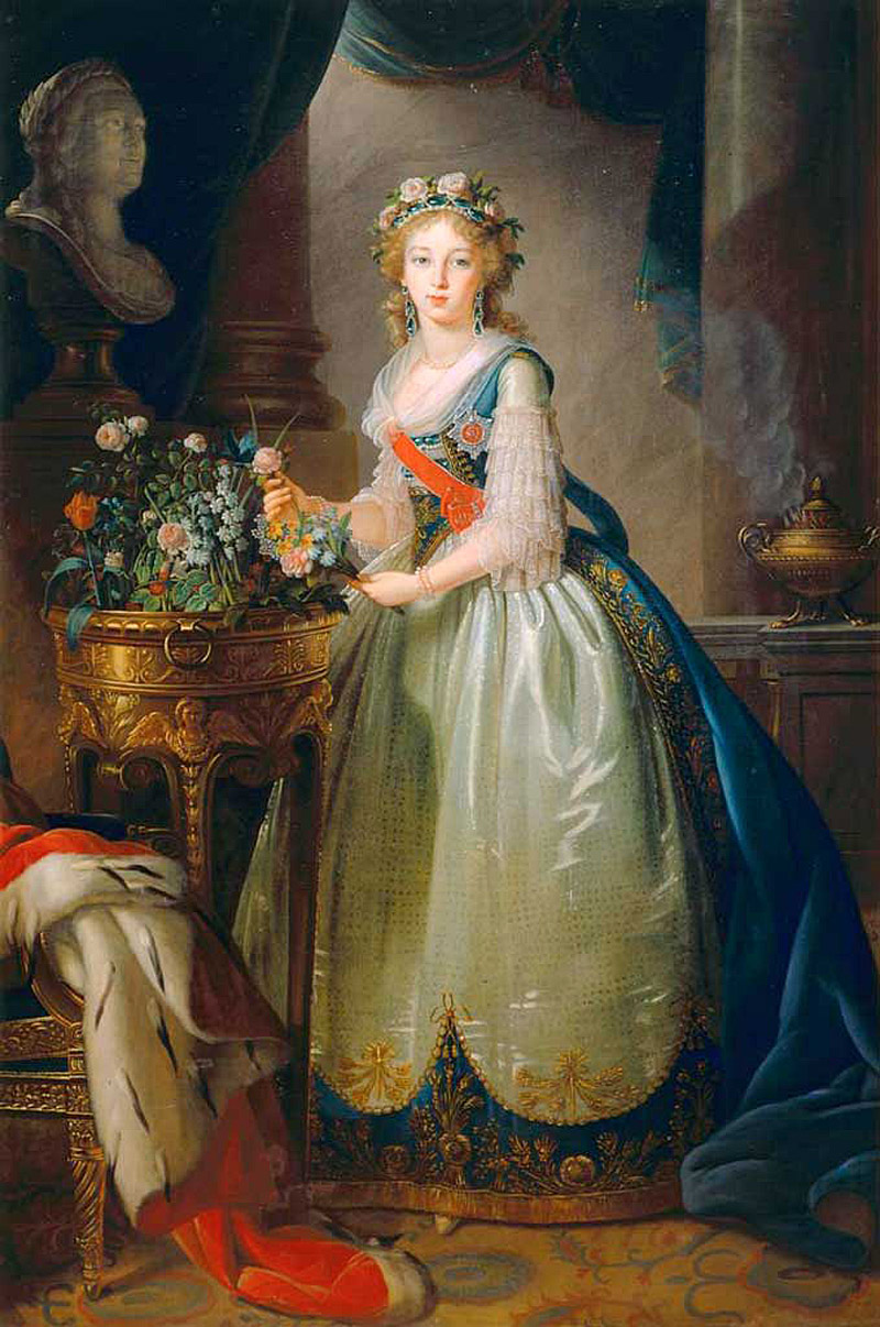 В своих мемуарах Виже-Лебрен писала: «Граф Эстергази подал мне руку, и мы отправились через парк, где я заметила у окна одного из домов на первом этаже молодую особу, поливавшую горшок с гвоздиками. Ей было не более семнадцати лет; правильные и тонкие черты дополнялись идеальным овалом; приятный цвет кожи своей бледностью безупречно гармонировал с выражением ангельской кротости ее лица, которое обрамлялось потоком пепельных волос. На ней было легкое белое платье, небрежно перепоясанное по тонкой, как у нимфы, талии. Юная сия особа столь изящно выглядела на фоне комнаты с колоннами, задрапированной серебристо-розовой тканью, что я невольно воскликнула: "Вот истинная Психея!" Это была принцесса Елизавета, жена Александра. Она пригласила меня к себе и наговорила множество лестных слов... С сожалением я рассталась с нею и навсегда сохранила память об этой очаровательной встрече».Очаровательно! Прекрасно передана вся прелесть лица "Русской Психеи".