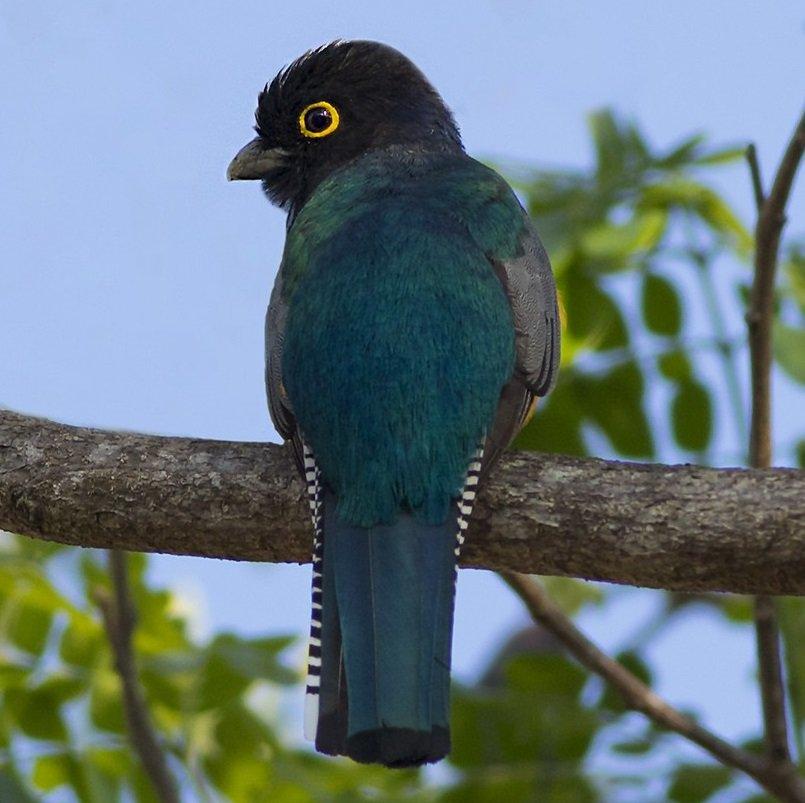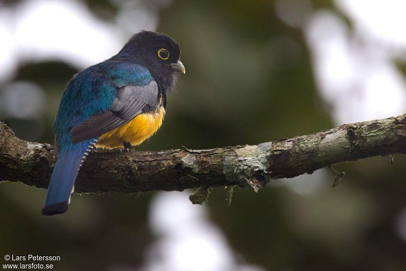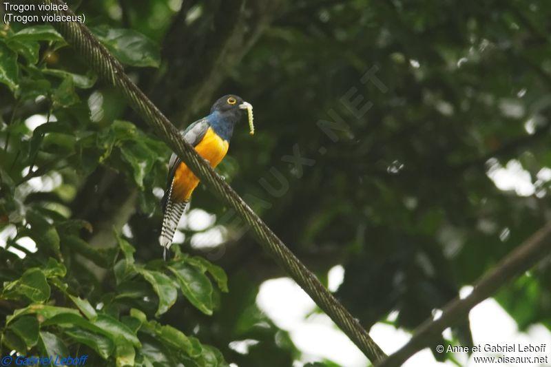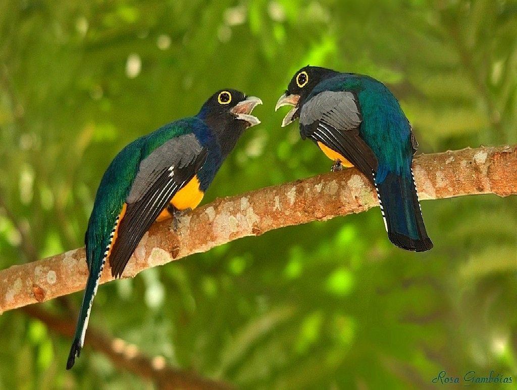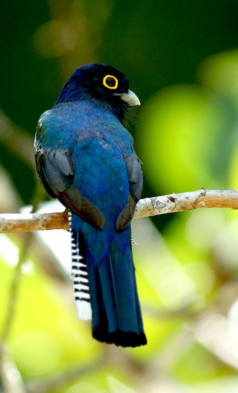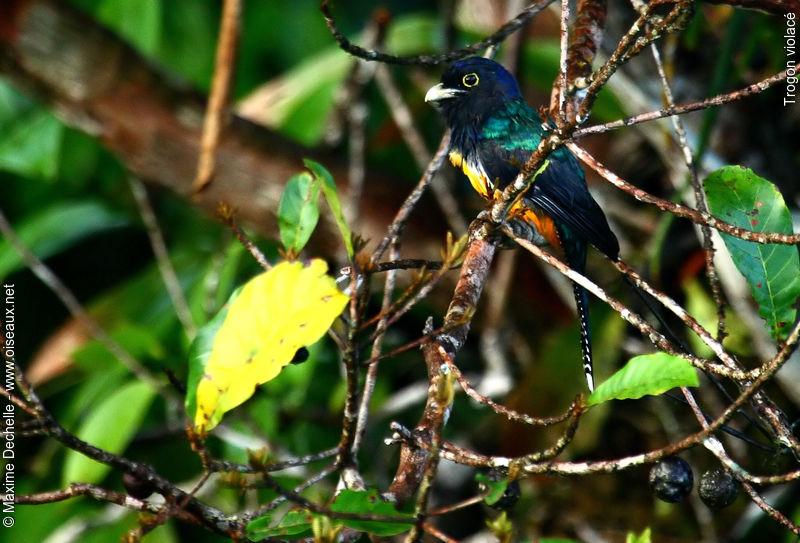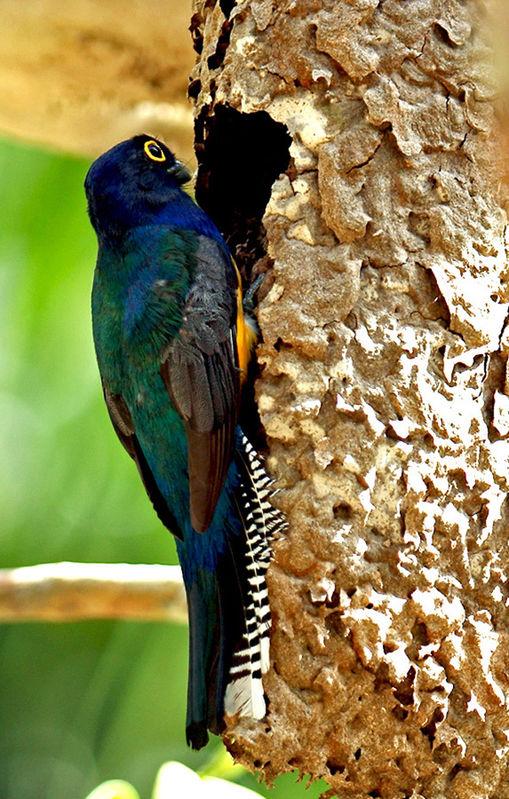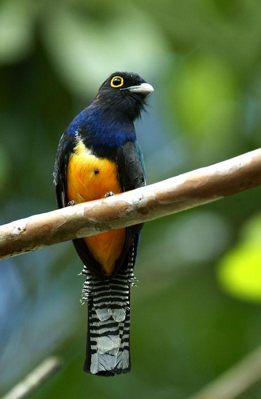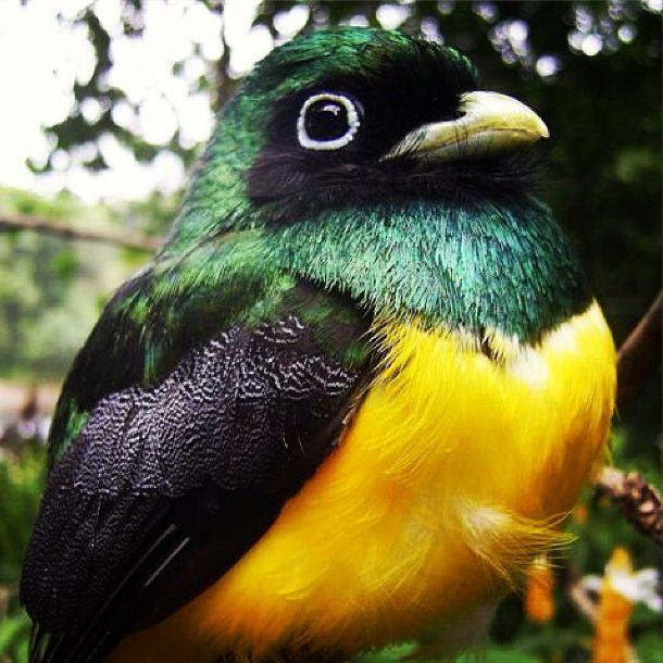 Фиолетовый (гвианский) трогон - яркая красивая тропическая птичка размером ок. 25 см. Грудь, шапочка и шея имеют невероятный, переливающийся на свету пурпурно-синий цвет. Тонкая белая полоса отделяет грудь от ярко-желтого брюшка. Хвост – черно- белую полоску. У самки сине-фиолетовая часть превращается в грифельно-серую, а брюшко более бледное.Настоящий красавец!