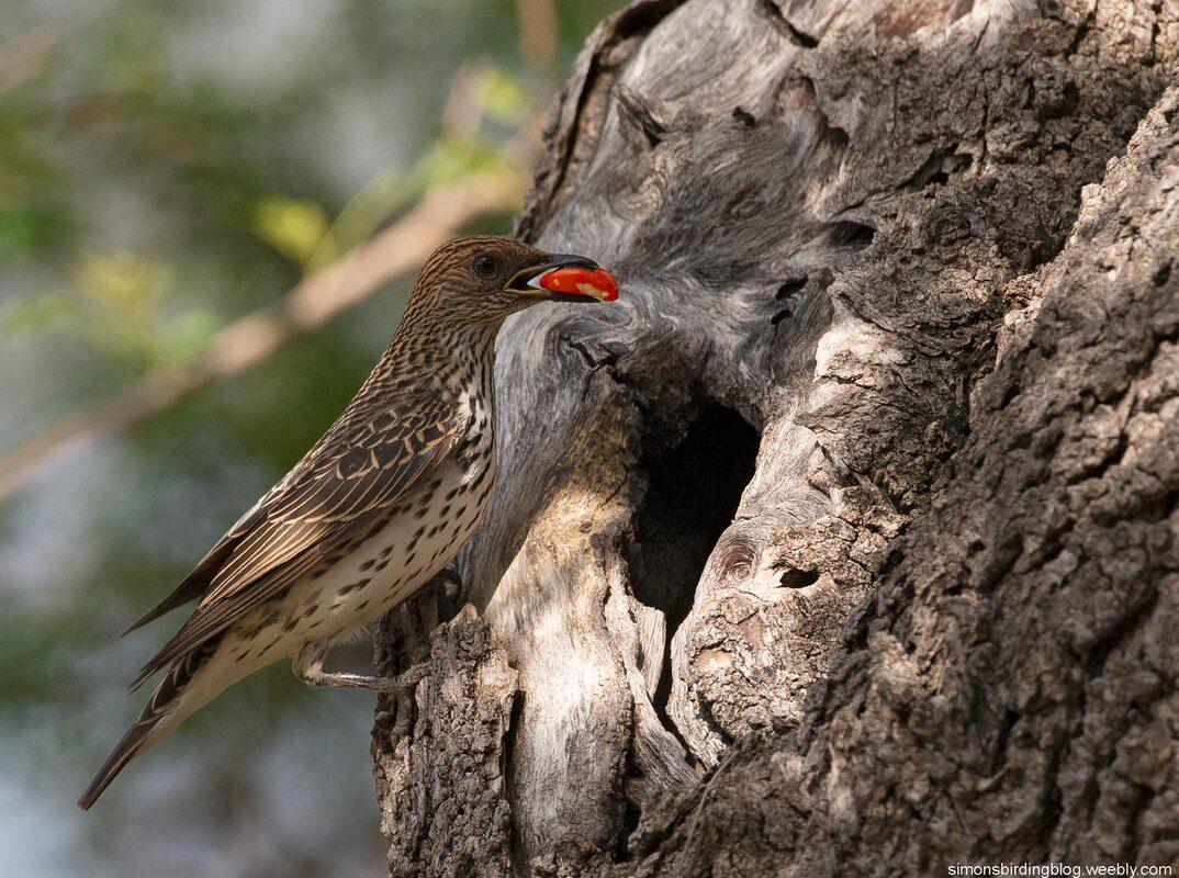Как часто это бывает, чем ярче самец, тем скромнее выглядит самка. Перышки самок окрашены в коричневые тона с белыми пятнышками.