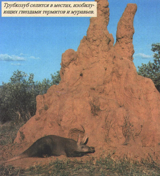 Местные жители (обитает он только в Африке) кличут его «абу-делаф» — «отец когтей». Когти действительно солидные и сплюснуты, как лопата. Обнаружив термитник, трубкозуб становится на задние лапы, опирается на мощный хвост и передними лапами крушит «крепость». Затем в руины погружается длинная морда плюс 30 см высунутого языка.