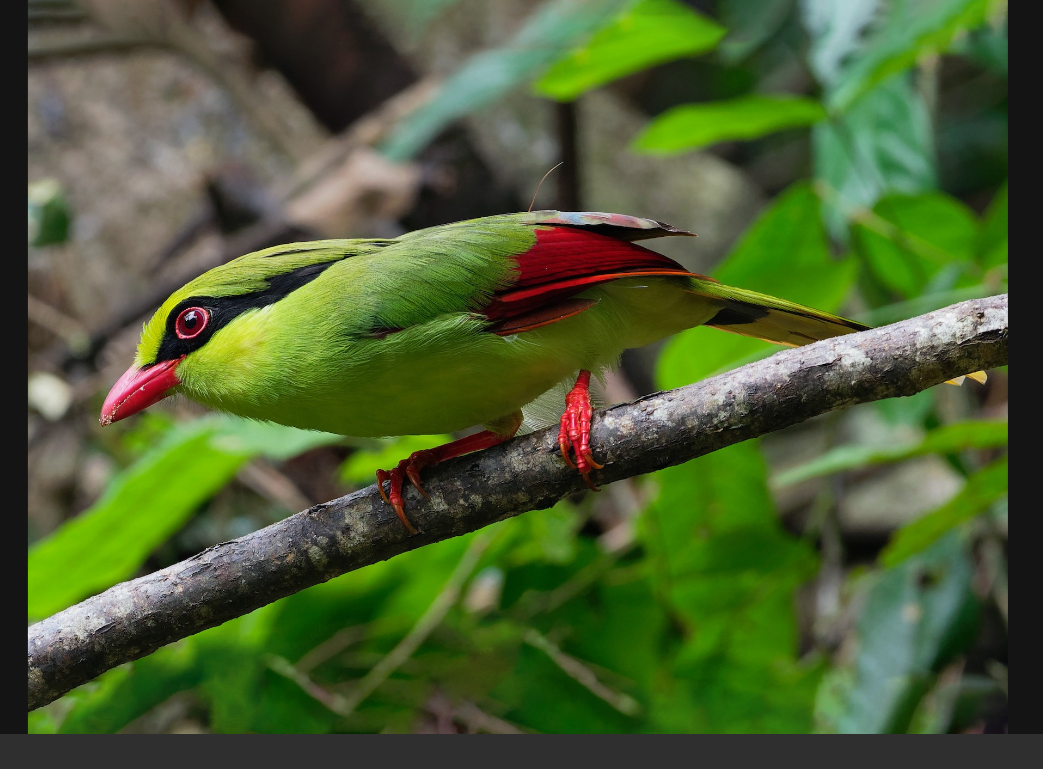 Оперение ярко-«флуоресцентное»: зеленая спинка, желтая (или зеленоватая, в зависимости от ареала) грудка, красные крылья, ярко-красные клюв и ноги. Да еще черная «маска», роднящая их с Зорро))