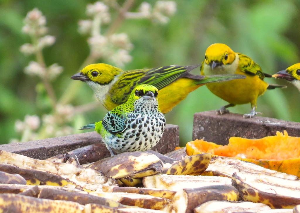 Как у всех танагров, у птиц крепкие клювы и цепкие когти, которыми удобно цепляться за ветки.