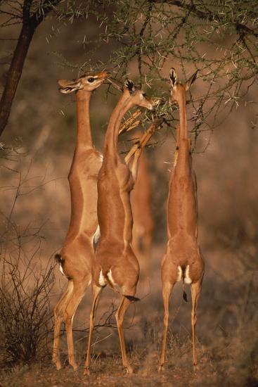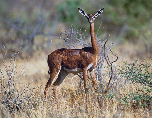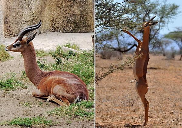 Ведь питаются геренуки листьями, ветками и цветками деревьев и кустарников, расположенных на большой высоте. Причем влагу получают из того же корма и могут вовсе не пить всю жизнь.