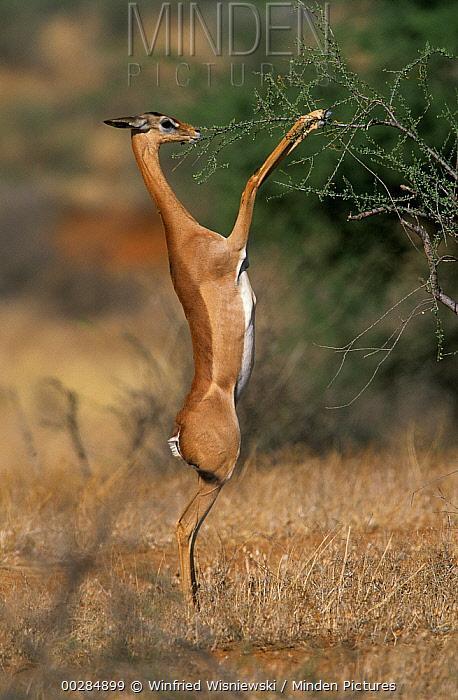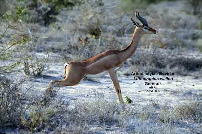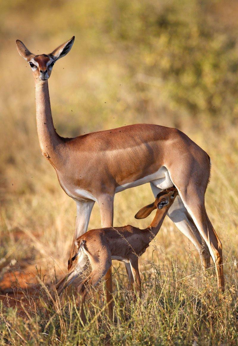 Геренуков невозможно перепутать с другой антилопой. "Гарануг" на суахили - "жирафья шея". И действительно, голова сидит на очень тонкой и длинной шее. Другая особенность - способ кормежки.Такой милый, удивленно-вопросительный взгляд)