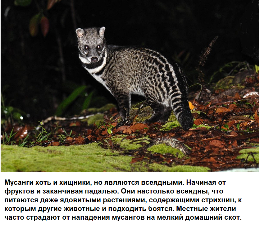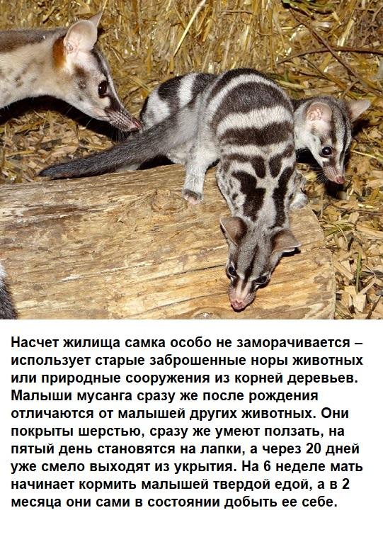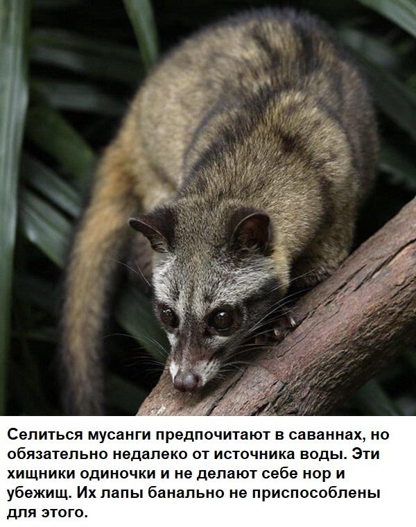 ответитьМусанг (циветта) - родственник мангуста. Внешне он и напоминает мангуста, но по повадкам больше похож на кошку. Большую часть жизни проводит на деревьях Местные жители часто приручают мусангов, и те живут в домах на «кошачьих» правах: пьют молоко, спят в ногах хозяина и исправно ловят грызунов и тараканов.Милый пушистик, и палитра интересная.