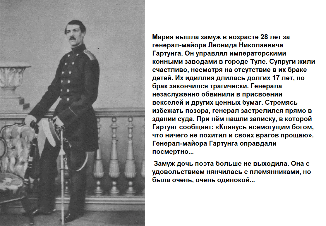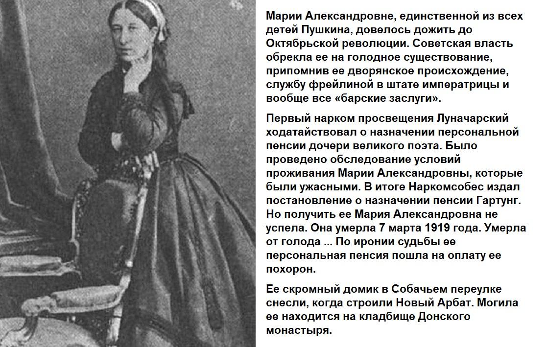 Мария была единственным ребенком из четырех детей Александра Пушкина, у которого сохранились хотя бы смутные воспоминания об отце. Она родилась в 1832 году в городе Санкт-Петербурге. Поэт присутствовал на родах своей жены и плакал, увидев свою копию в крохотном свертке, который ему передала в руки акушерка