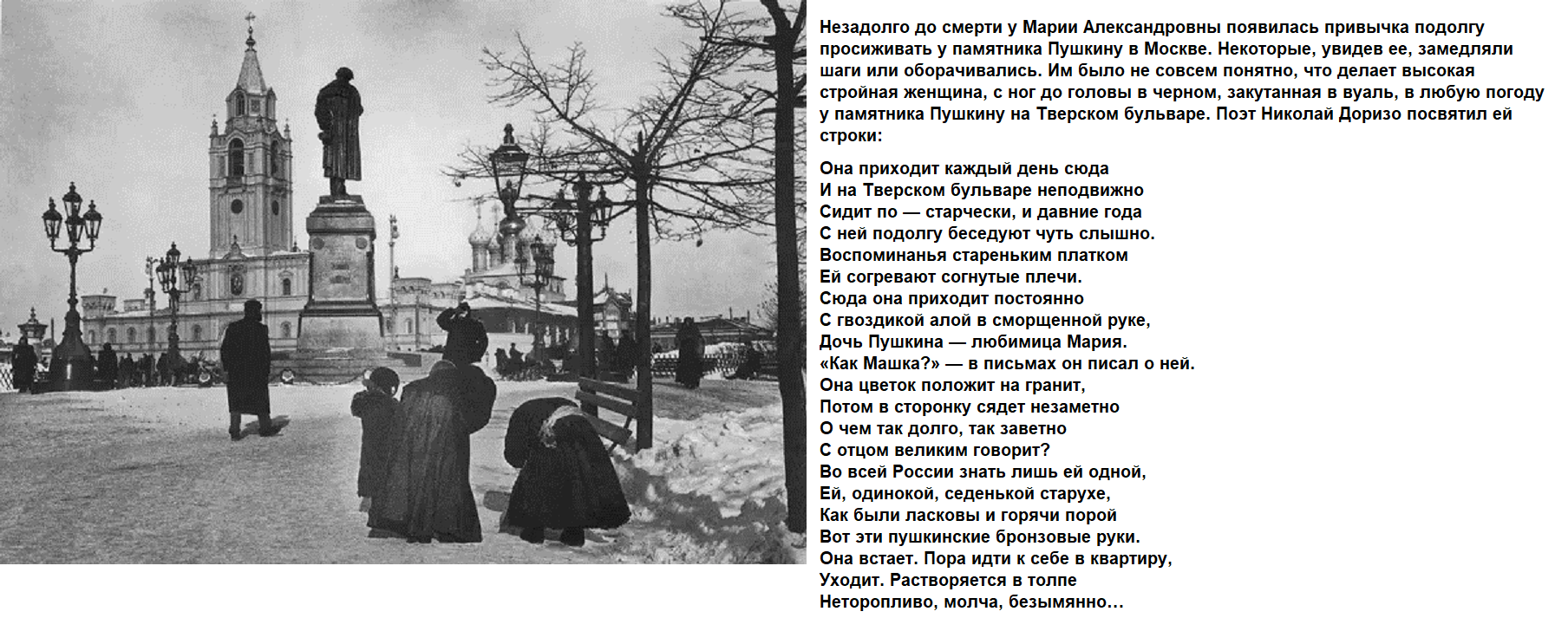 Пушкин назвал дочь Марией в честь своей бабушки. Девочка стала его любимицей. Когда он возвращался домой, сначала целовал жену, а затем отправлялся в детскую полюбоваться своей Машей. Он долго стоял возле колыбели, разглядывая девочку. Очень часто в такие минуты в его глазах сверкали слезы...