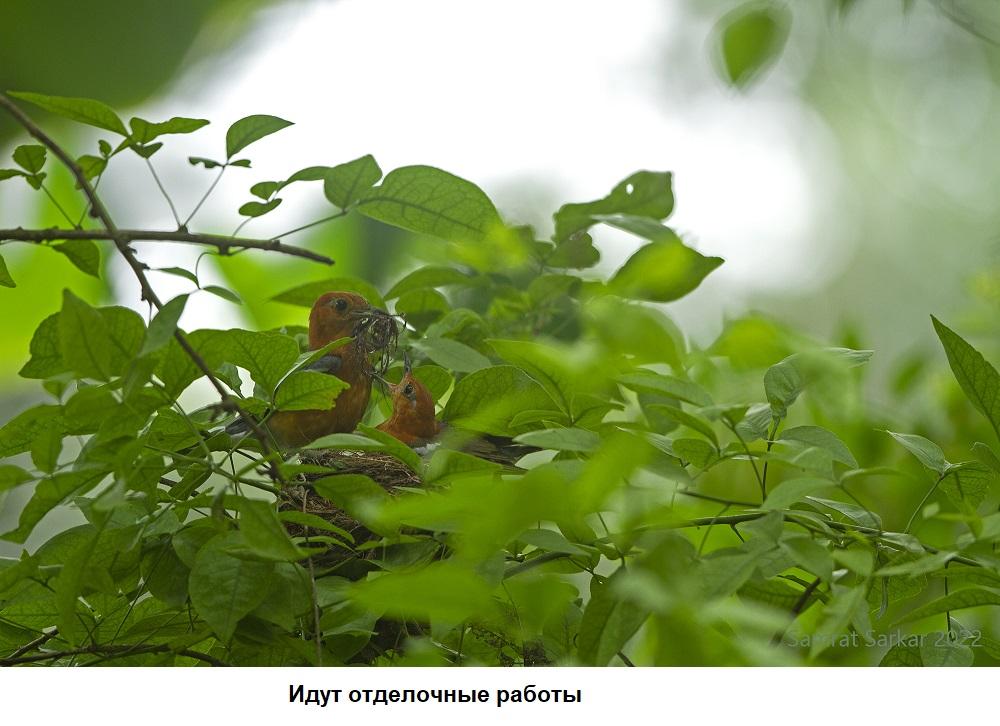 Обычно гнездятся на деревьях на высоте до 4,5 м от земли. Гнездо дружно строиться обоими птицами из веток и корешков растений, выстилается листьями, мхом и хвоей. Так же дружно выкармливают потомство. Птенцы покидают гнездо в возрасте 12 дней.