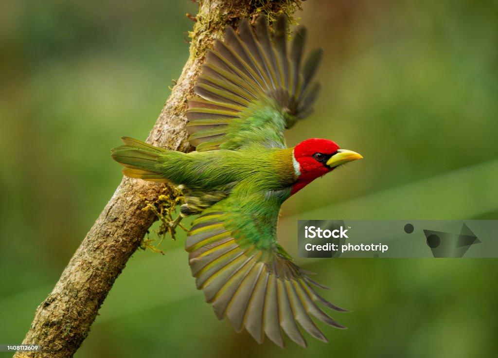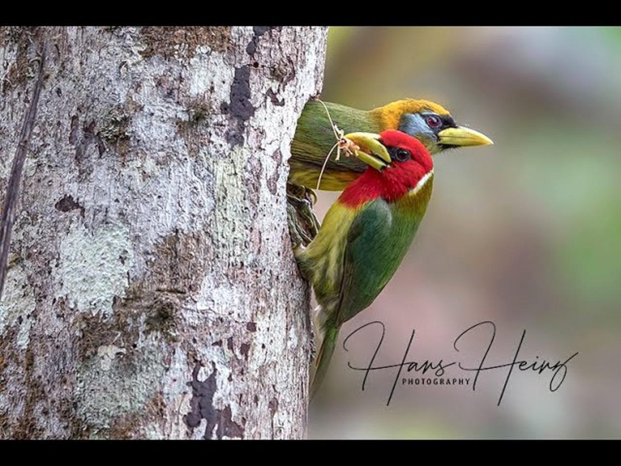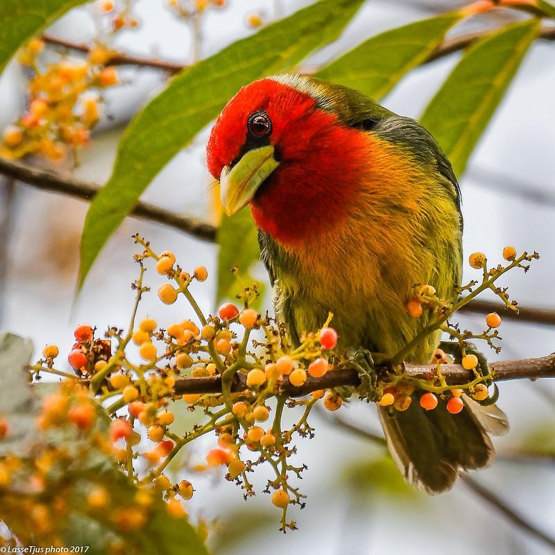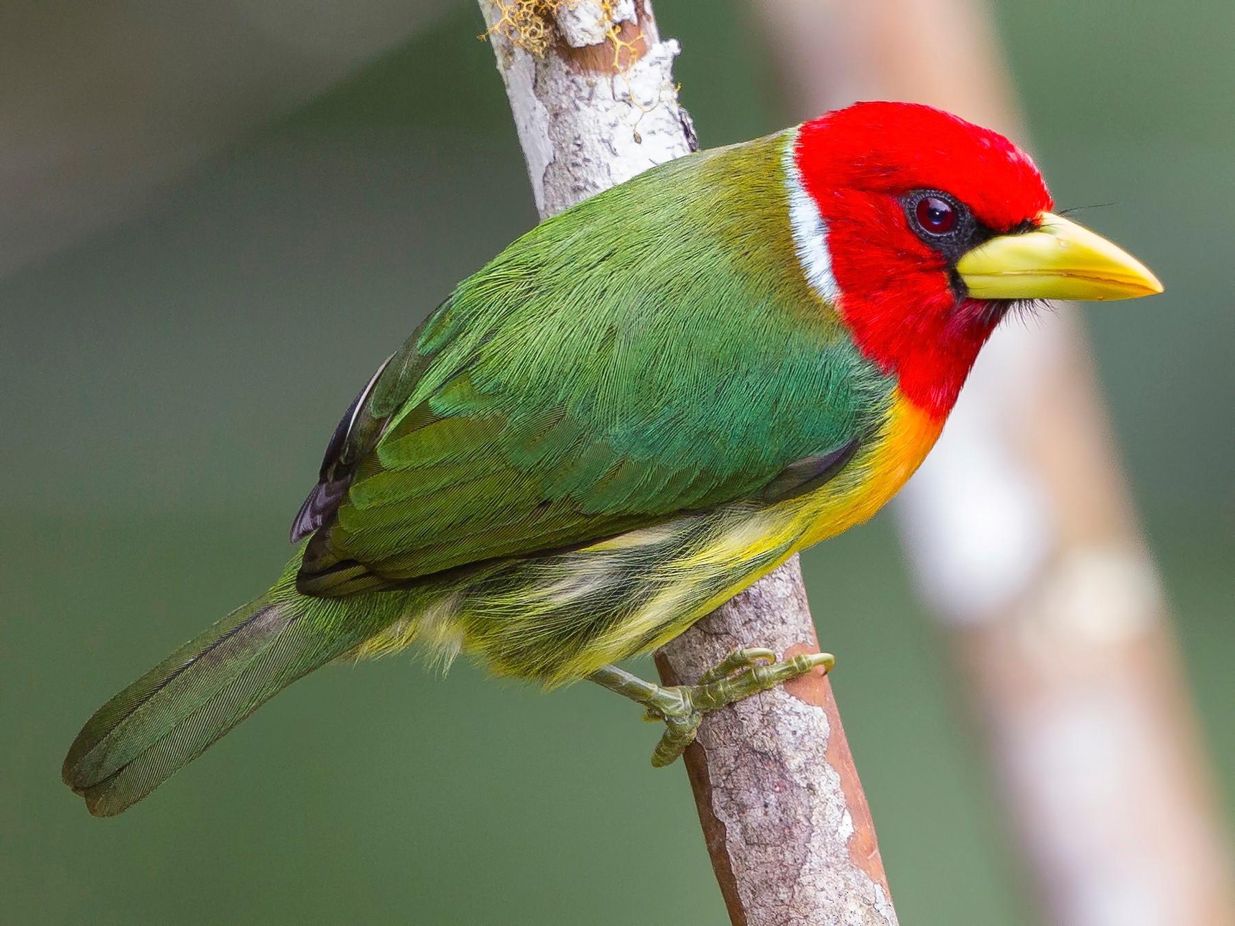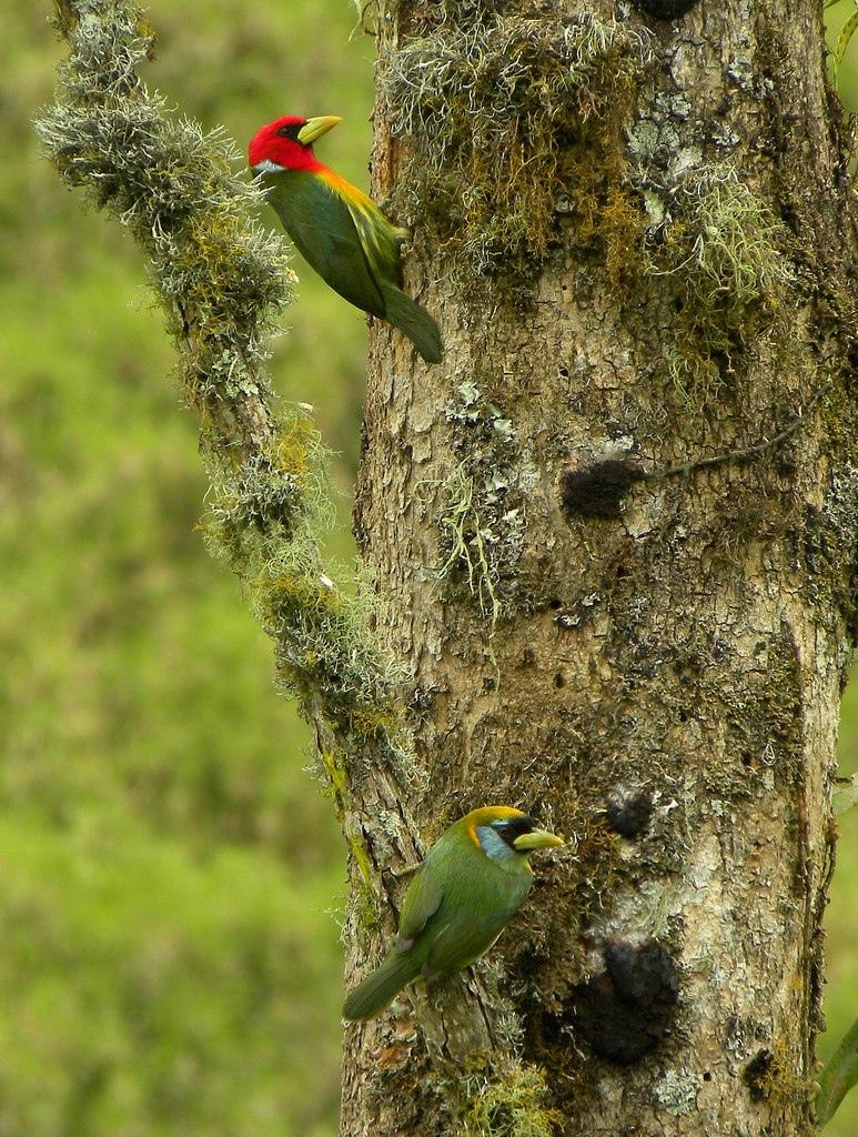 Самец с красной головой, самка с оранжево-голубой. Они так отличаются, что сначала их даже описали как разные виды.