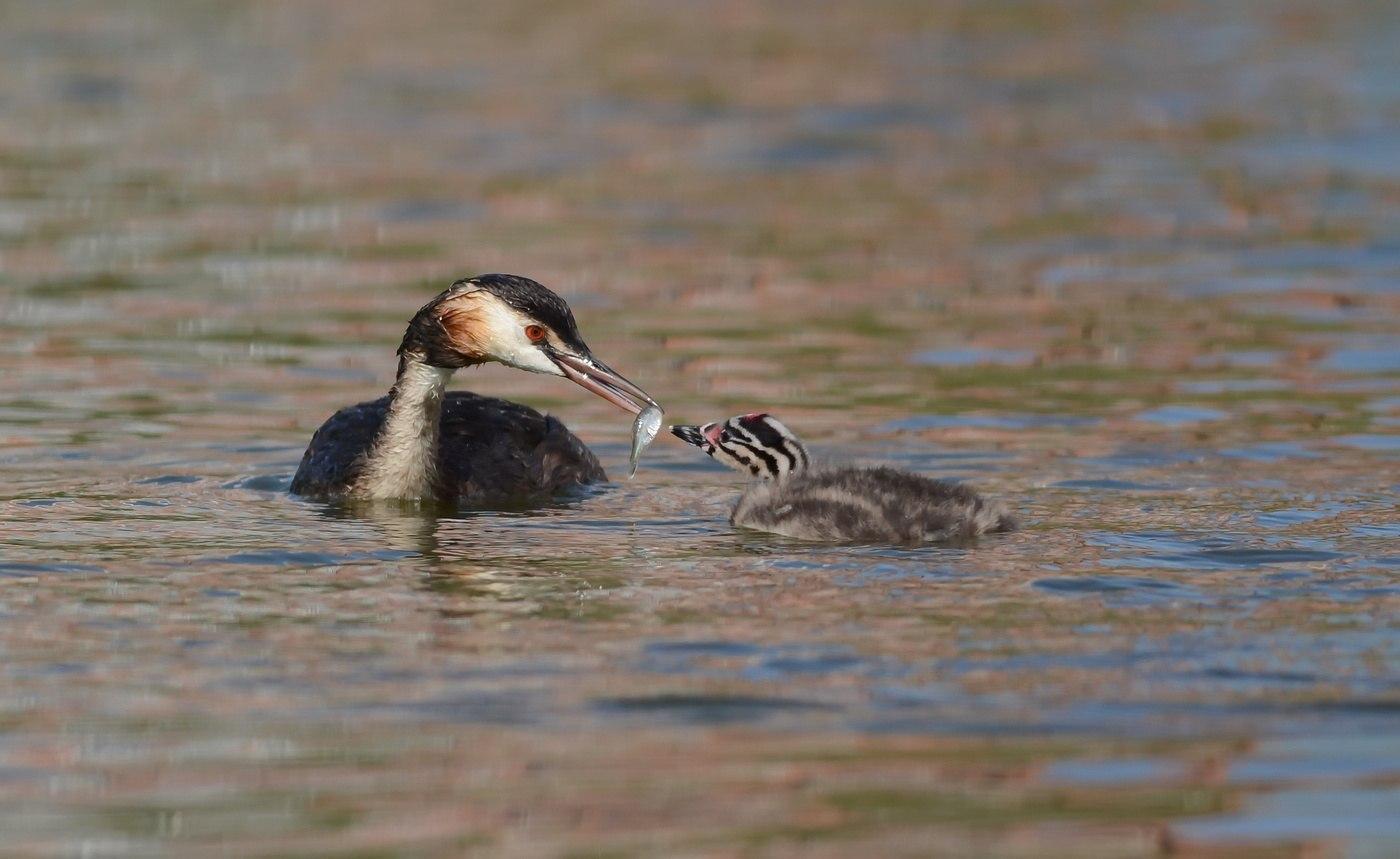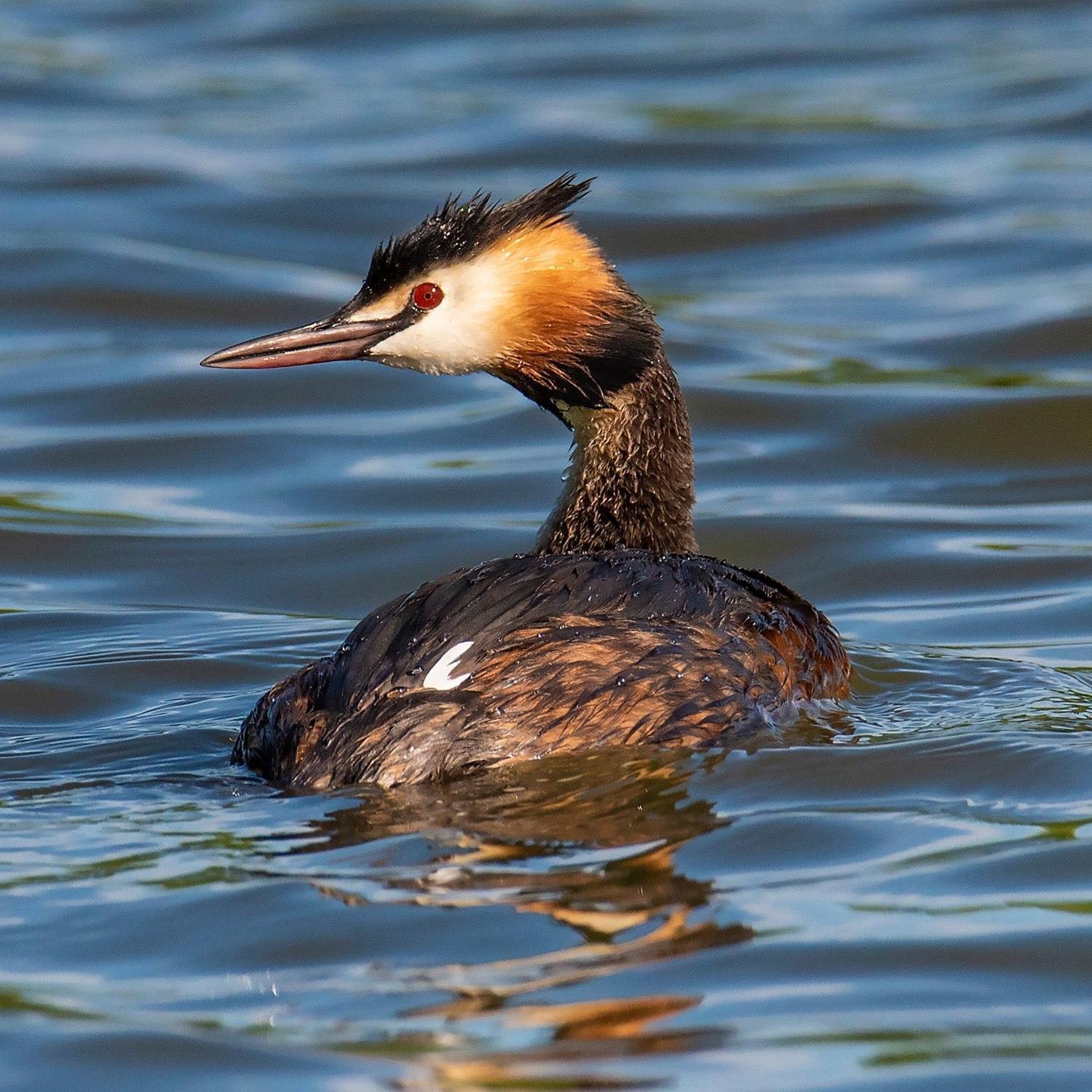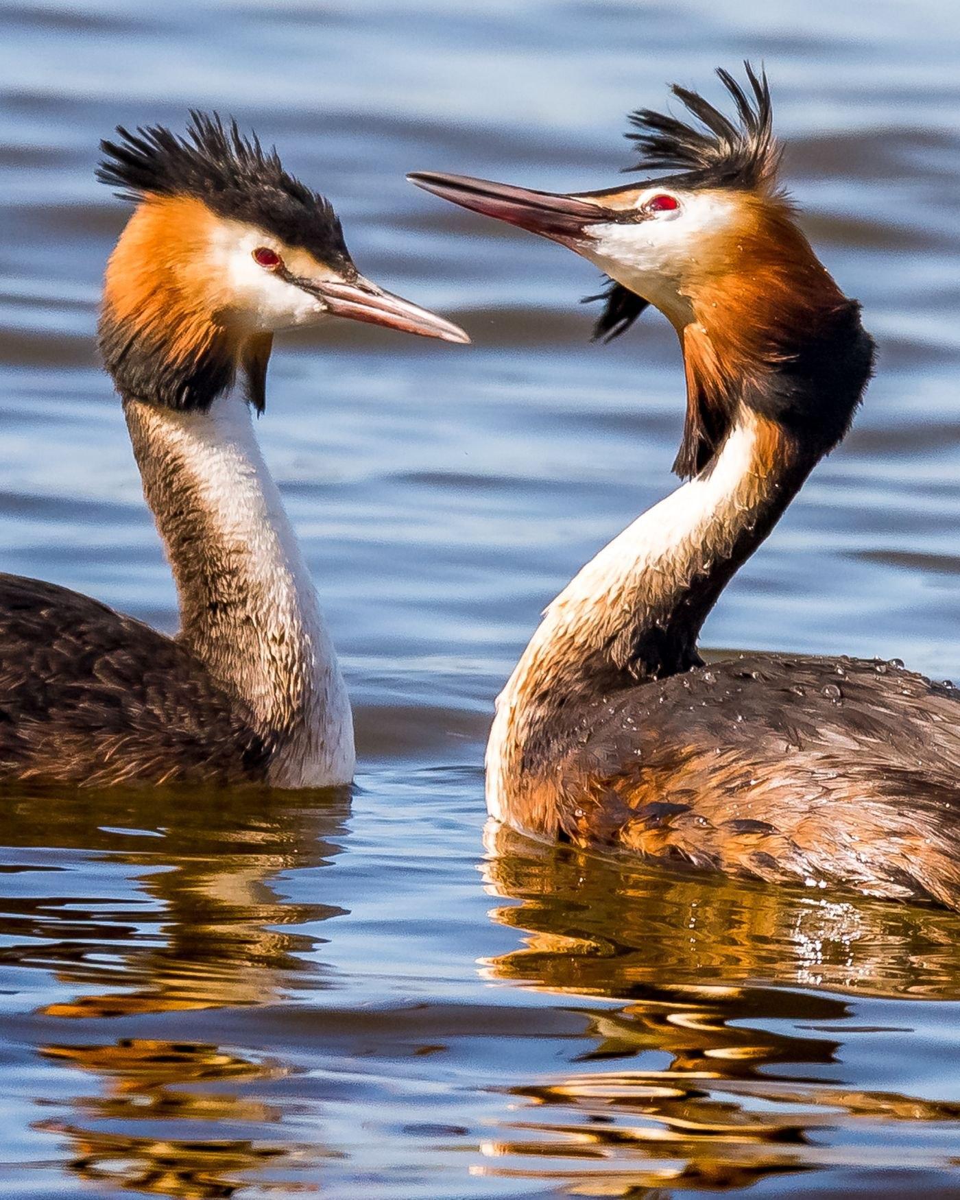 ответитьЛатинское название птиц - Podiceps cristatus («украшенная гребнем»). И правда по весне птиц легко опознать по двум тёмным пучкам перьев, похожих на «ушки», и рыжему «воротничку» вокруг шеи. Помимо хохолка они отличаются длинной шеей и удивительным рубиново-красным цветом глаз.Очень красивая птица получилась!