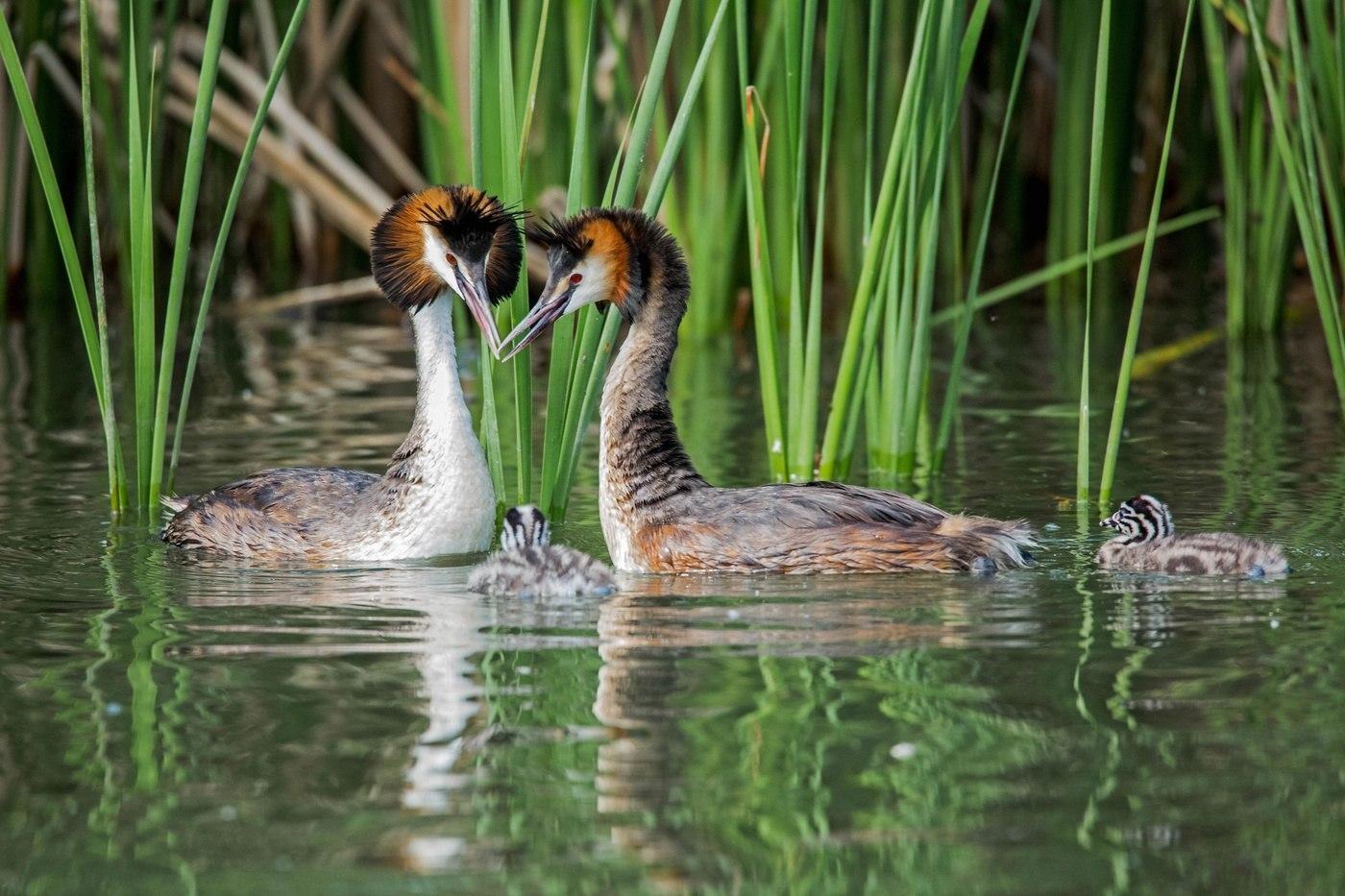 На российских водоемах чомги появляются в конце марта - начале апреля. И начинают свой брачный ритуал, во время которого самец и самка исполняют «танец», а потом преподносят друг другу букеты из водорослей, как основу для строительства будущего семейного гнездышка.