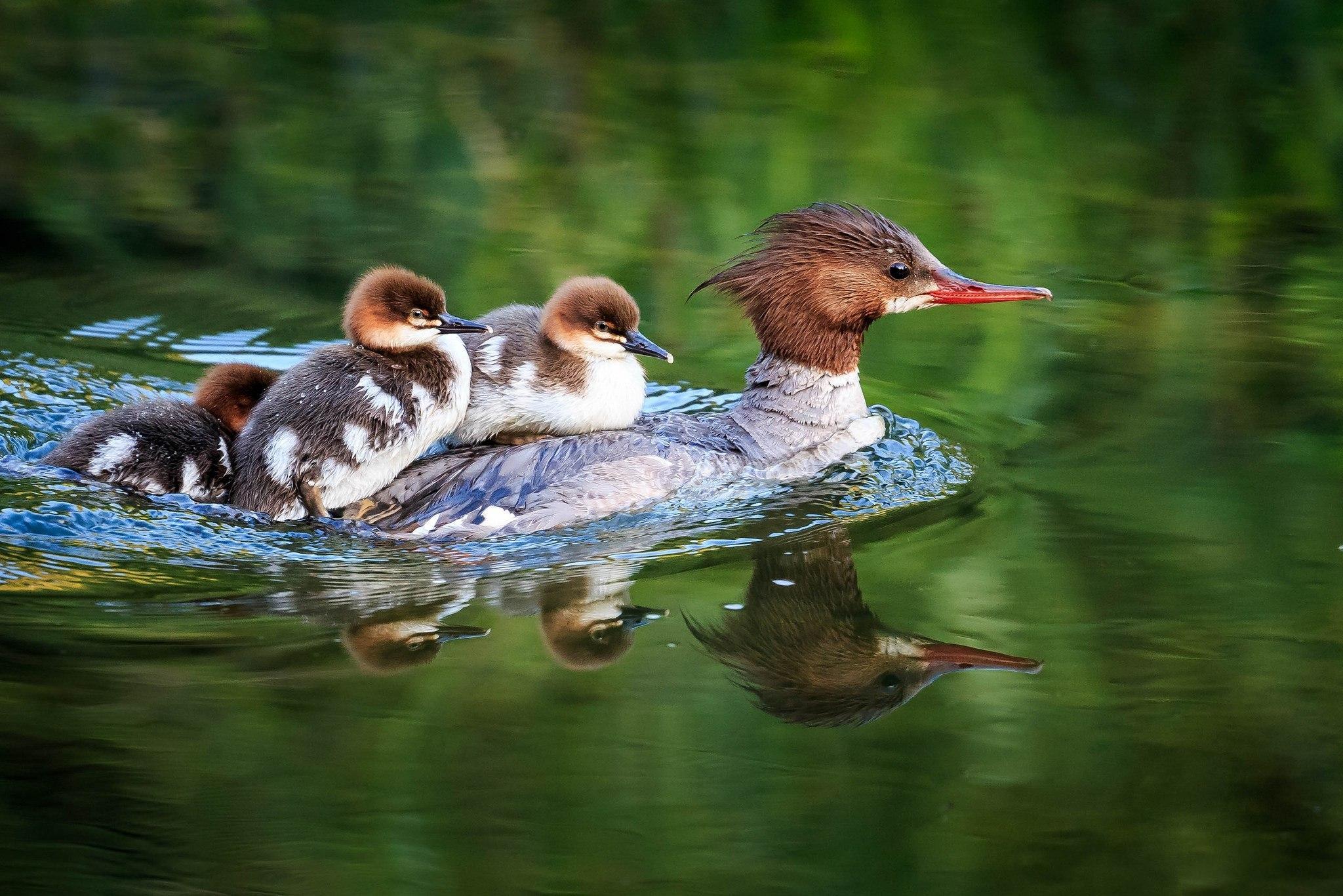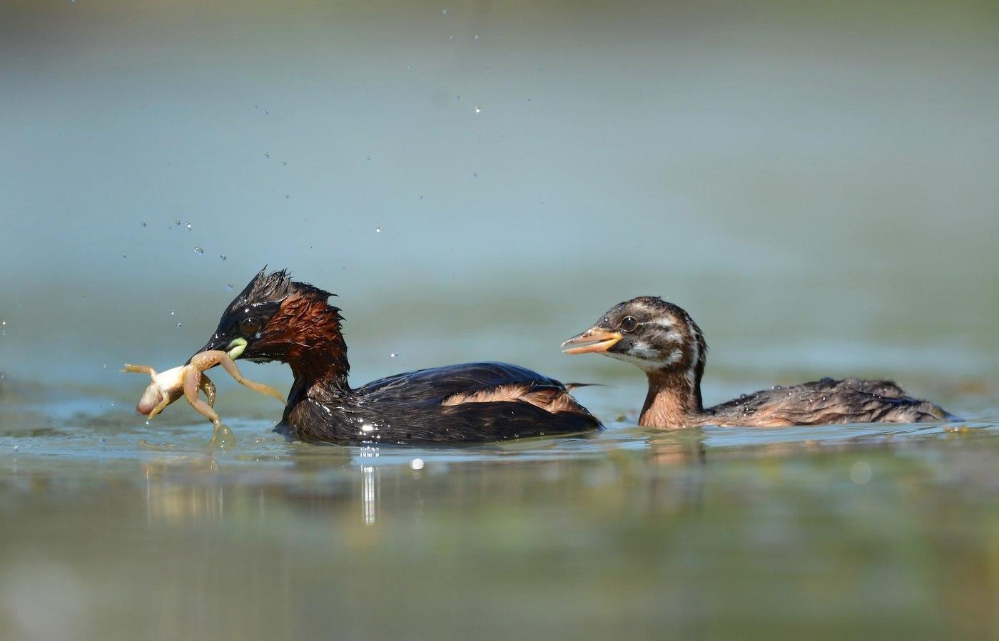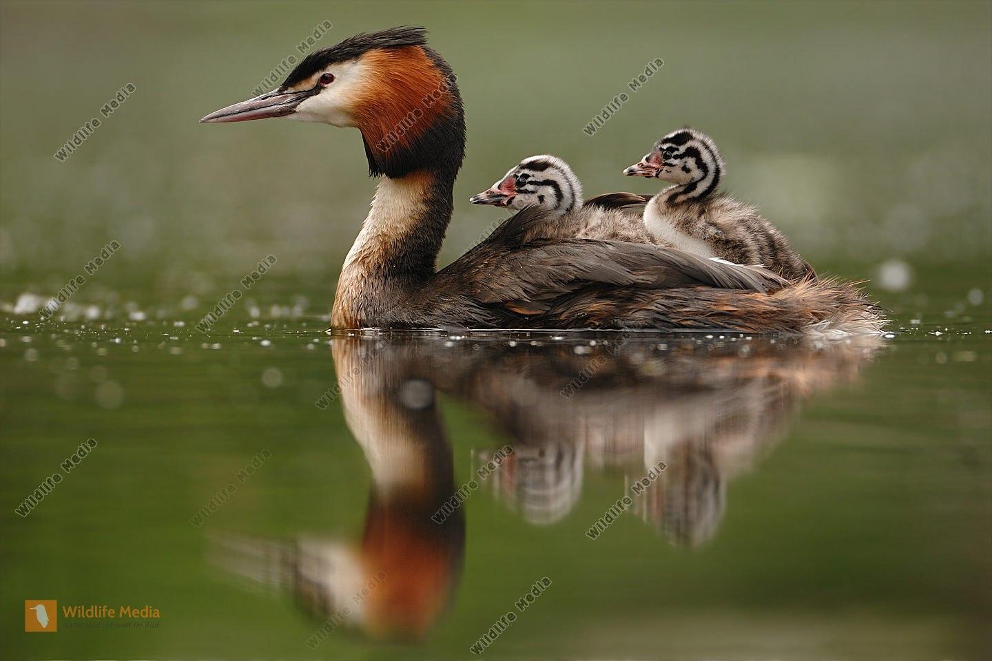 Как только вылупляется последний птенец, чомги забирают малышей и покидают гнездо. Ближайшие 3 недели птенцы будут жить на спине матери. В середине лета можно наблюдать трогательную картину - плывующая мама-чомга с птенцами на спине. В случае опасности чомга прячет птенцов в своем оперении и ныряет с ними под воду. К концу первого месяца жизни маленькие чомгята уже самостоятельно плавают и учатся добывать себе пищу – рыбу, тритонов, моллюсков и водных насекомых.