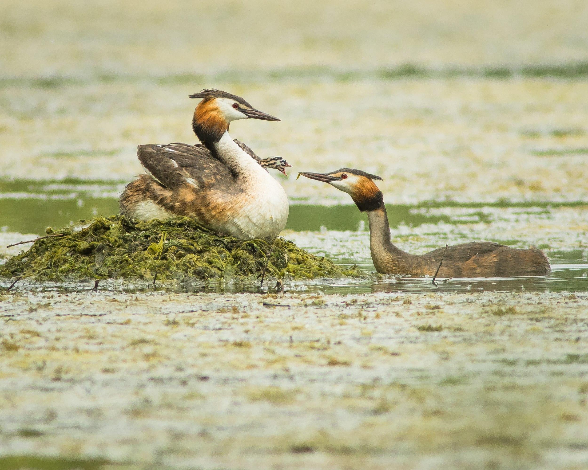Гнезда чомги строят тоже на воде, получается нечто, похожее на плавучий островок из камыша и водорослей