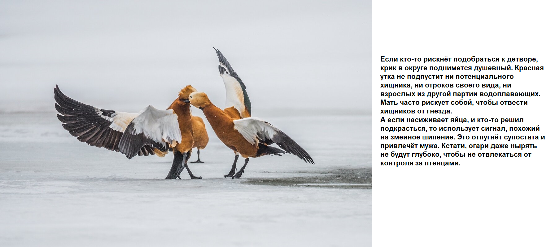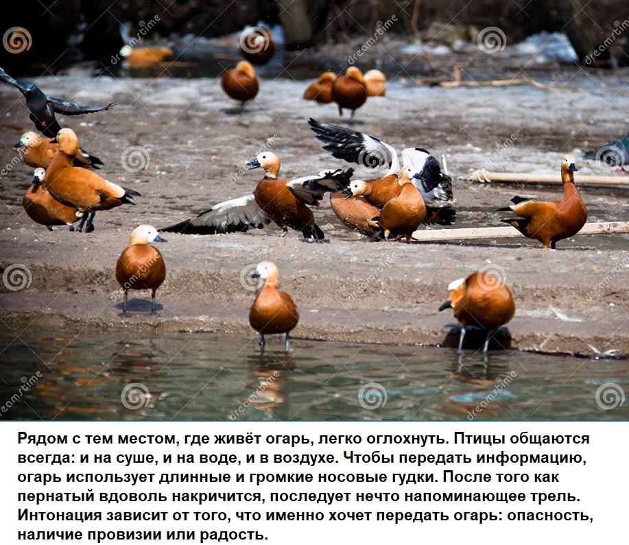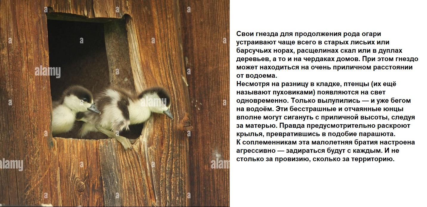 Характер у огарей под стать их окрасу - такой же огненно-вспыльчивый. Наверное именно поэтому огари предпочитают держаться обособленно, собираясь в большие стаи лишь вне периода размножения.