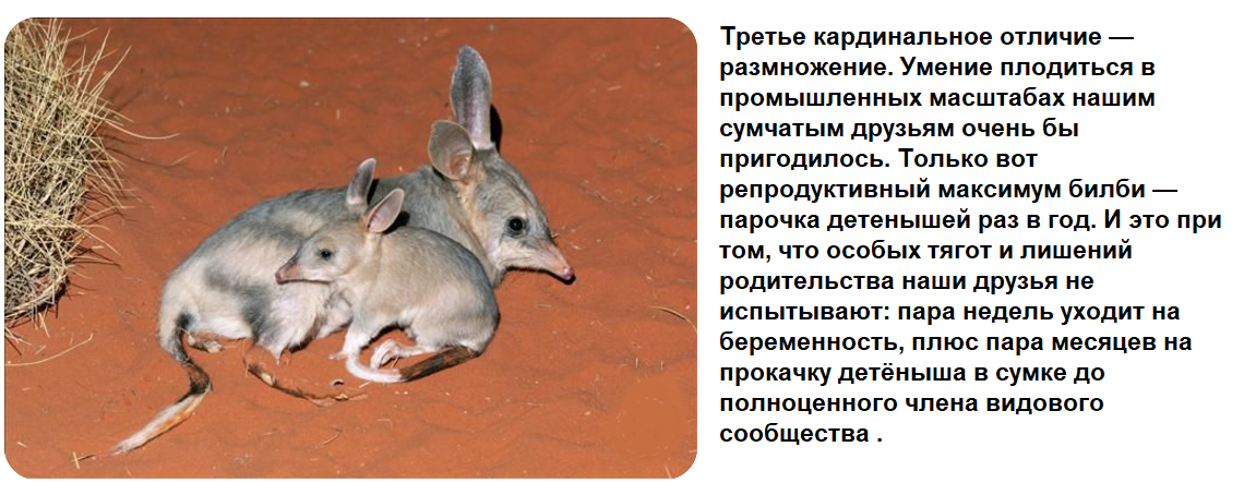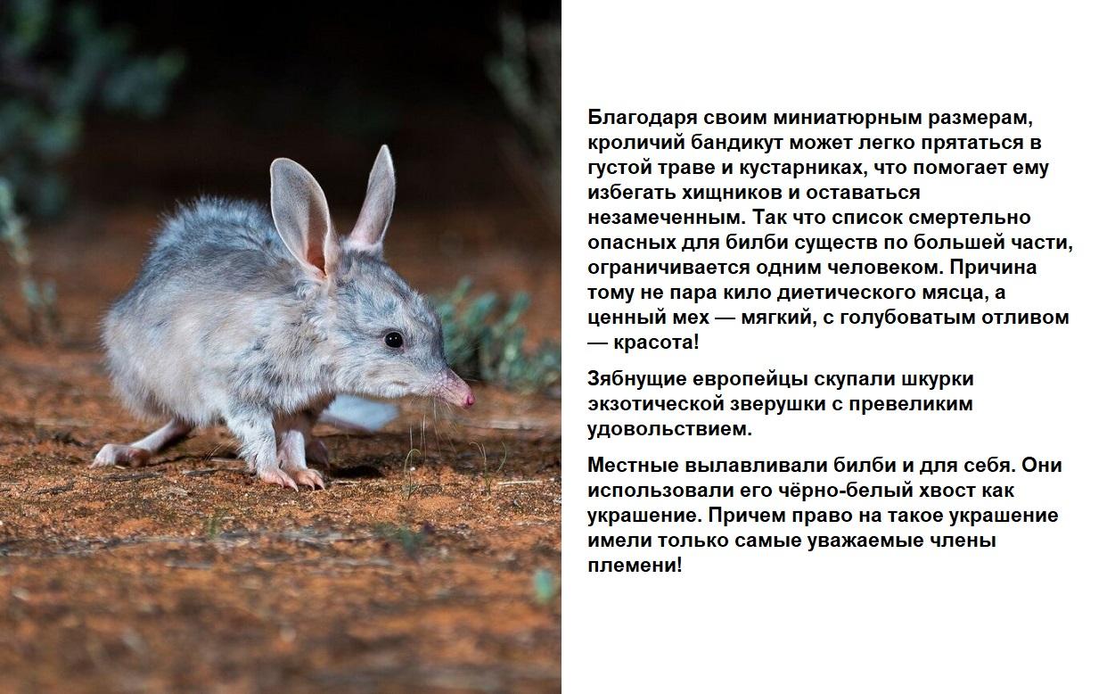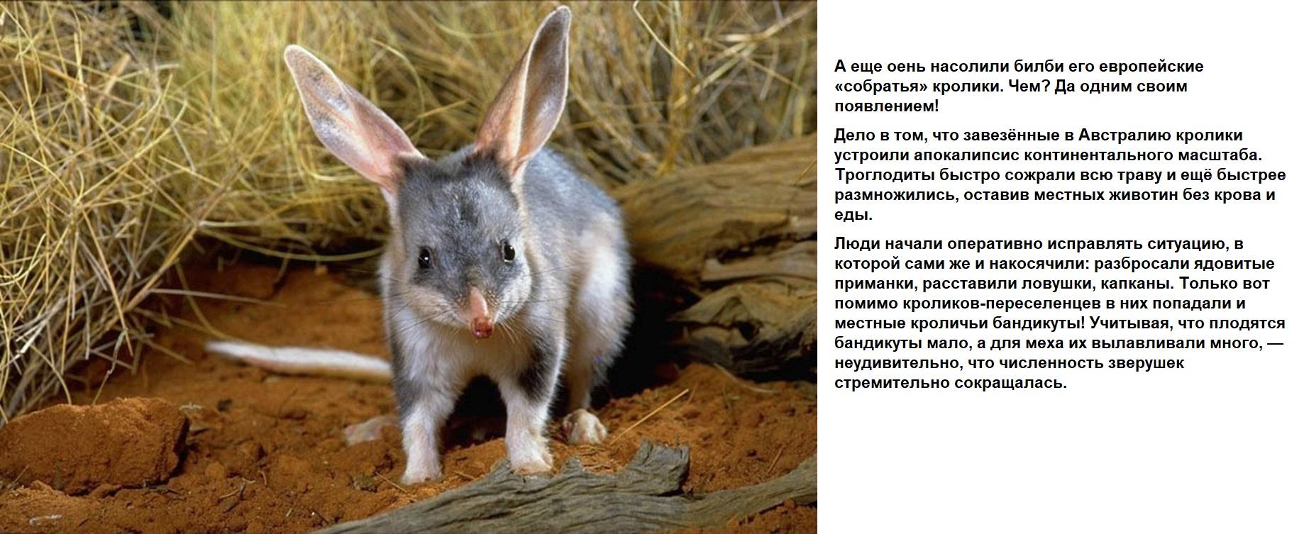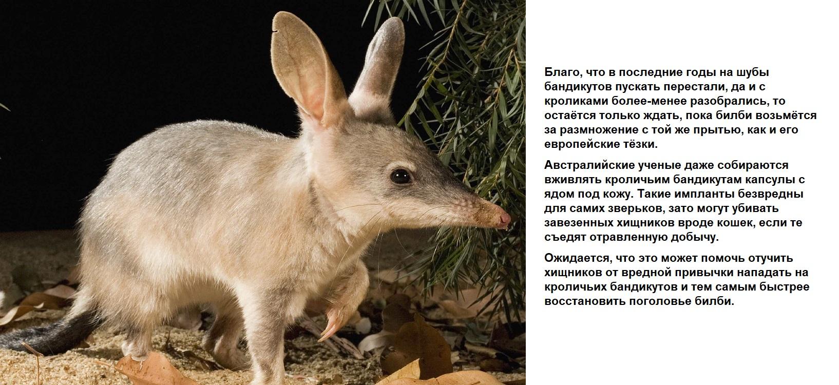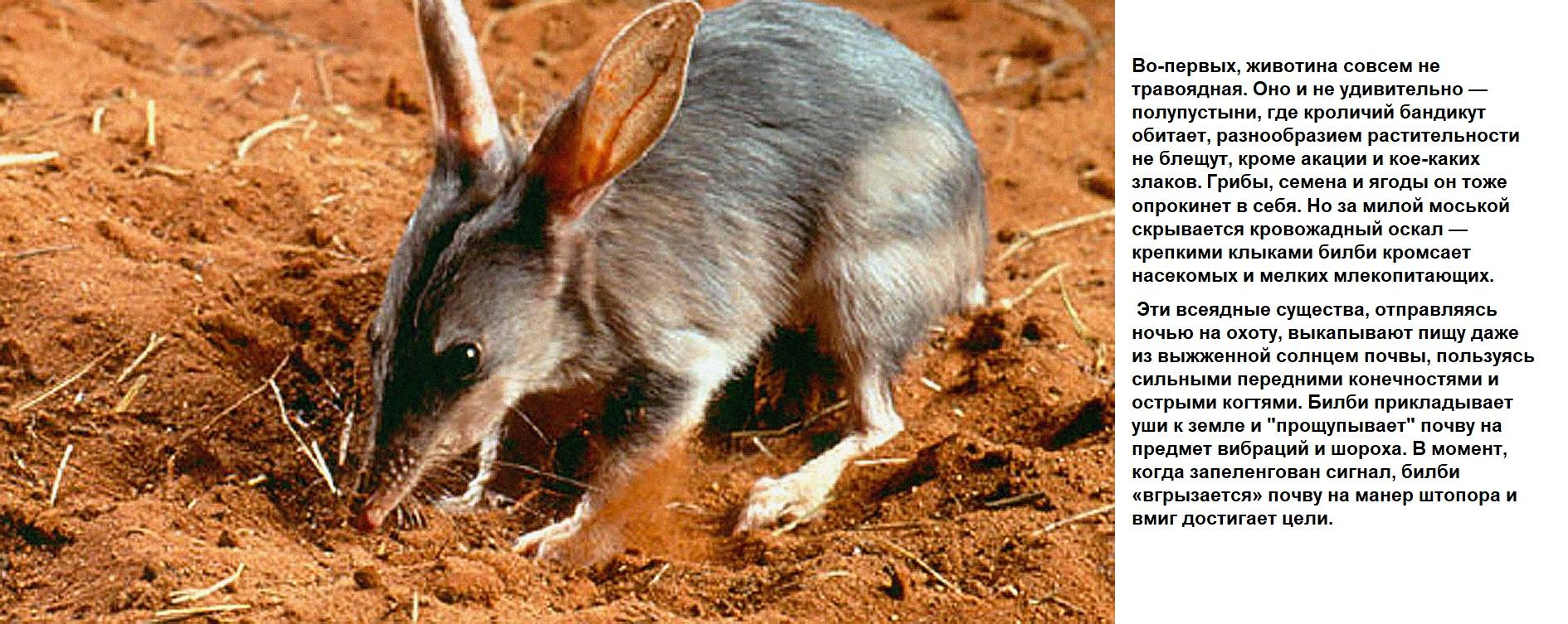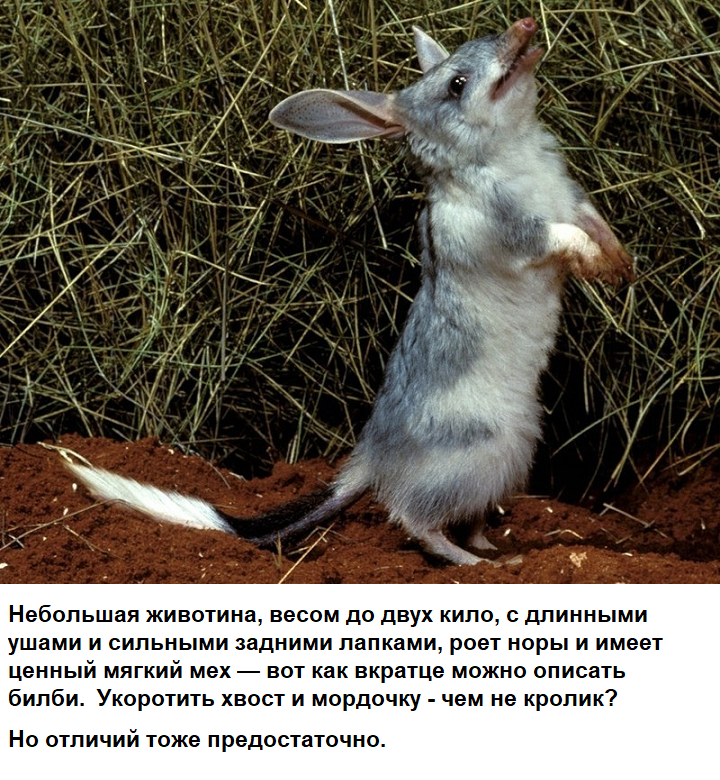 ответитьВ Австралии на каждого привычного зверя найдётся свой сумчатый аналог. В прошлом это были эпические создания, типа «львов», «волков» и «тигров». Но до 21 века дожила лишь кучка мелочи: «куницы», «кроты» и бандикуты — «сумчатые барсуки» или билби - одни из самых маленьких сумчатых животных в мире (20 - 30 см). Кроличий бандикут, ни кроликам, ни барсукам родственником не приходится. Но схожестей с лопоухим у него и вправду достаточно.Интересный и красивый зверек, интересный кросс.