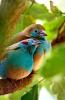 У самцов верхняя часть тела рыжевато-коричневая, а нижняя -голубая. В области уха красное полукруглое пятно, за которое вид и получил свое название. Но этим «украшением» могут похвастаться только взрослые самцы. Самочки окрашены похоже, но, как водится, бледнее. Впрочем, имеется 8 подвидов, отличающиеся интенсивностью и оттенками окраски.