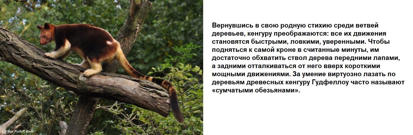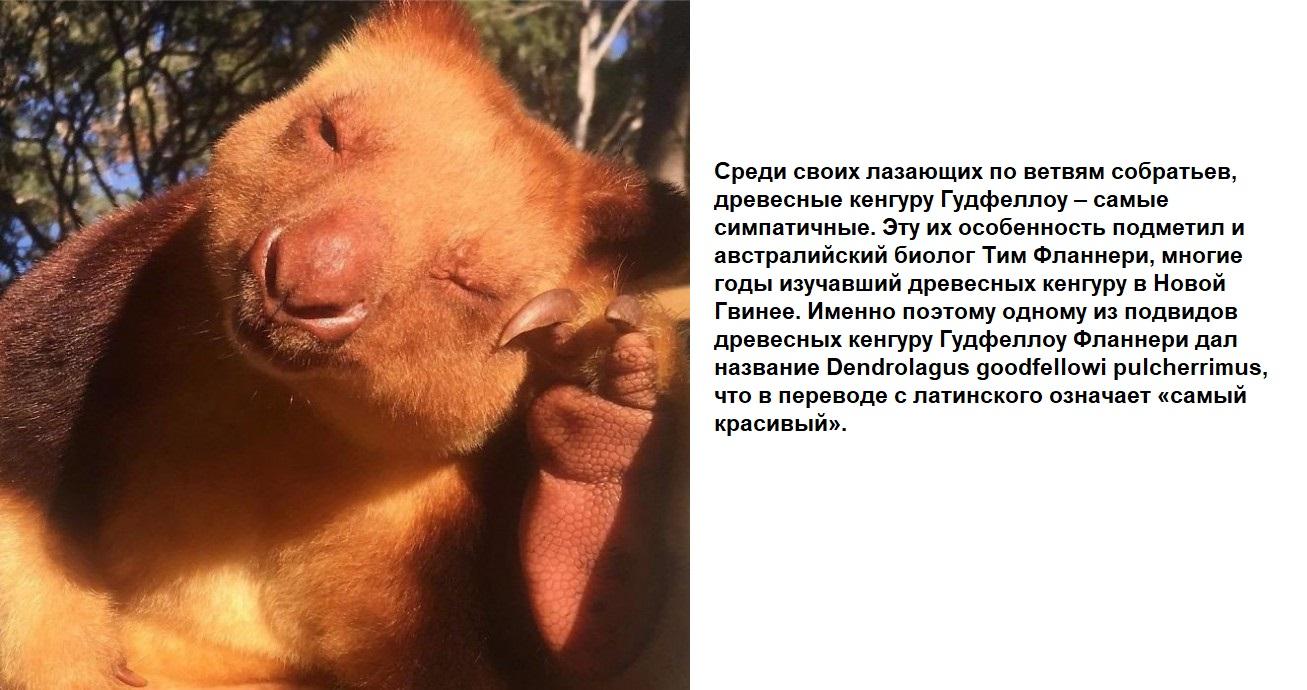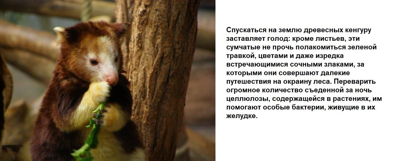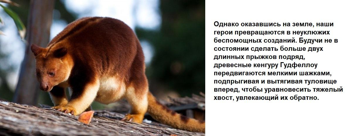 ответитьВнешний вид, образ жизни и поведение этих сумчатых почти не вписываются в привычные представления о том, какими должны быть настоящие кенгуру. Мягкая шерсть каштанового цвета, маленькая округлая голова, короткие задние лапы, умение виртуозно лазать по деревьям – это и многое другое отличает древесных кенгуру от их живущих на земле родственников.Мимишка какой!