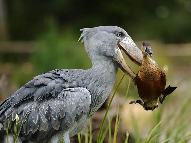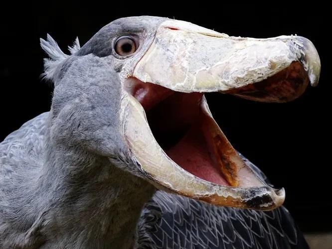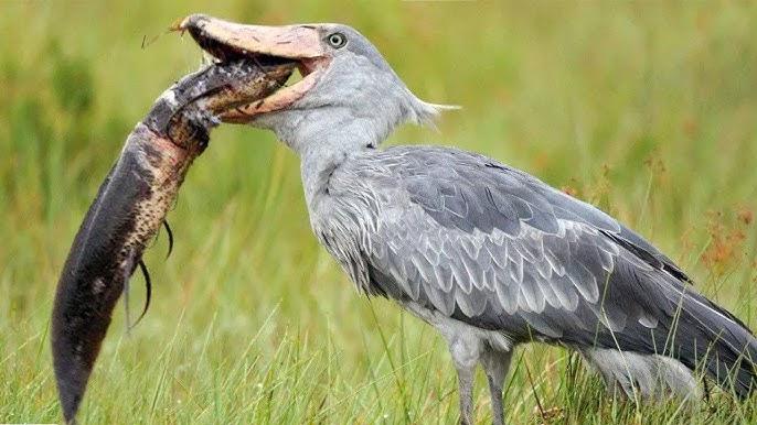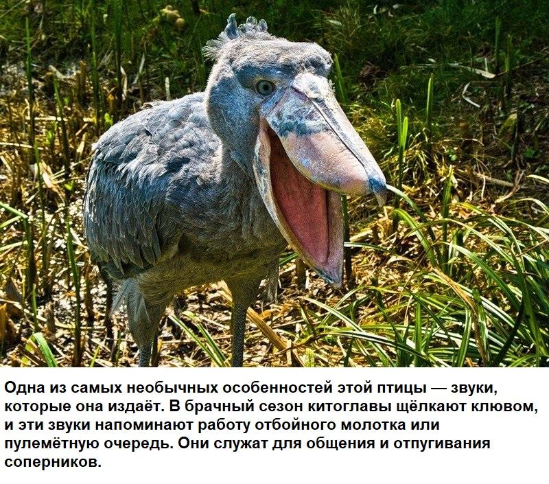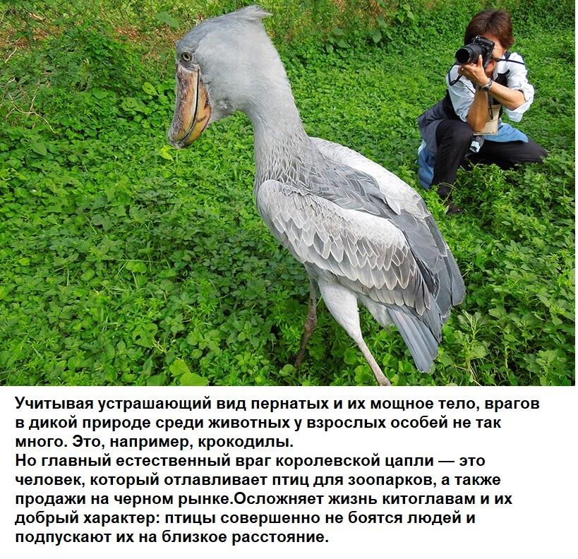 Китоглав (королевская цапля) - фантастическая птица с огромным клювом, смахивающим на башмак, похожа на удивительное инопланетное существо и напоминает сразу аиста, цаплю и пеликана. Она достигает 1.5 метров в высоту, а размах крыльев 2.5 м